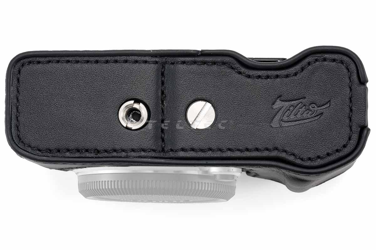 Das Tilta TA-T73-LCC-B Leather Camera Case for Fujifilm X-M5 - Black ist eine Ledertasche für die Fujifilm X-M5 Kamera, die mit einer 1/4"-20 Schraube an der Kamera befestigt wird. Sie bietet Schutz für die Unterseite des Kameragehäuses, wobei der Zugriff auf das Akkufach erhalten bleibt.