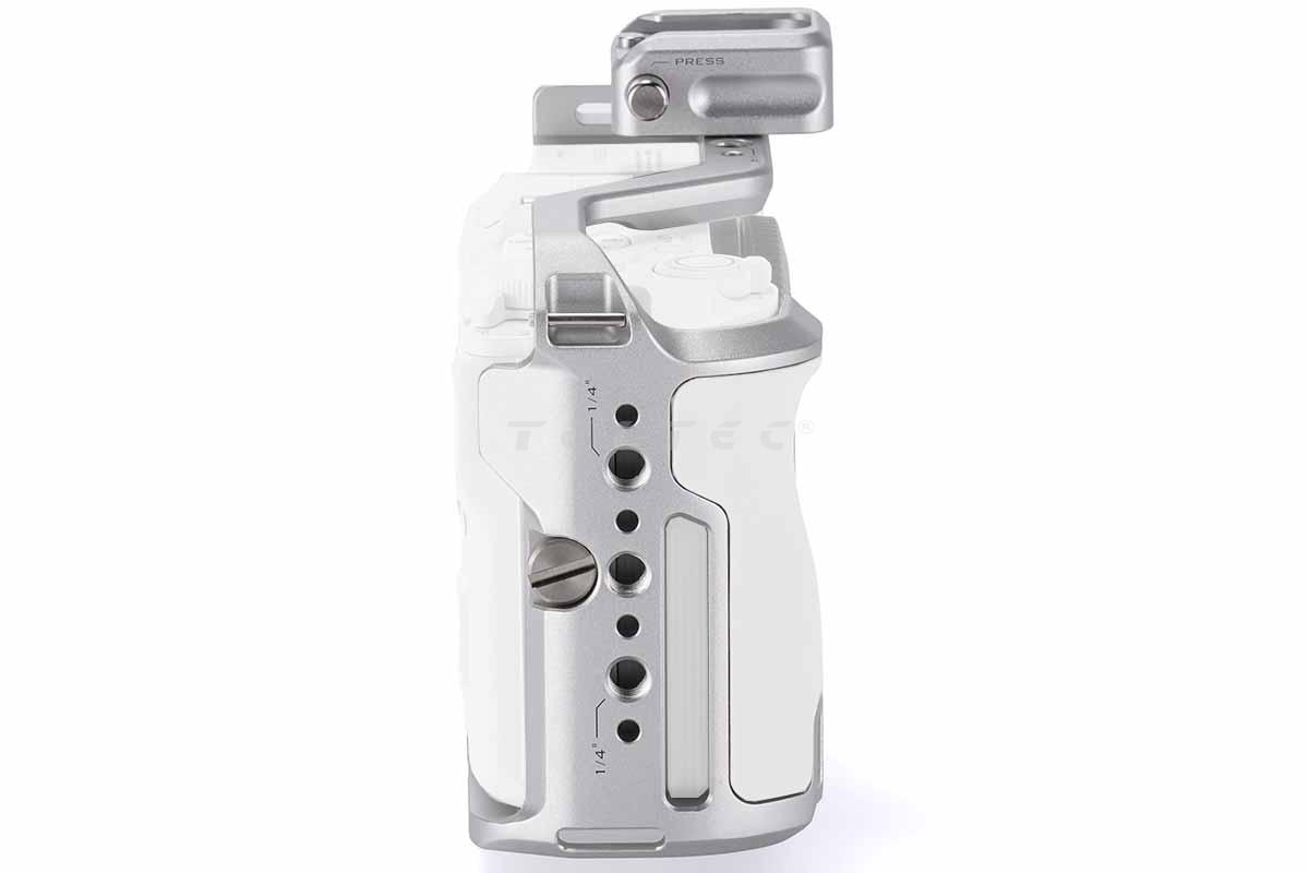 Der Tilta TA-T83-FCC-S Full Camera Cage for Canon R50 V - Silver ist ein voller Kamerakäfig in Silbern mit abnehmbaren Anschlusspunkten für die Canon R50 V. Er sorgt nicht nur für zusätzlichen Schutz der Kamera, sondern bietet auch mehrere Montagepunkte wie eine Kaltschuhaufnahme, NATO-Schiene und 1/4"-Gewinde mit Sicherungsstiften. Die ARCA Bodenplatte lässt sich ganz einfach mit anderem Equipment mit ARCA-Aufnahme verbinden. Zudem ist der Käfig so designt, dass NATO-Schiene, Kaltschuhaufnahme und auch ARCA Montageplatten abnehmbar sind. Der mit Silikon belegte Griff bietet eine gute Haptik und bleibt auch über längere Zeiträume angenehm in der Hand. Die wichtigsten Tasten und Zugänge bleiben frei, sodass der Workflow weitgehend ununterbrochen bleibt.