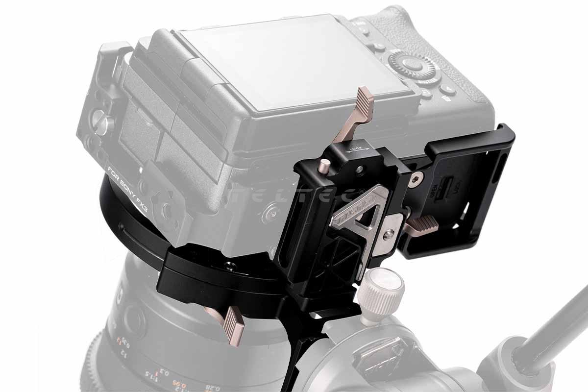 Das Tilta TA-VSB-SN-B Adjustable Vertical Support Bracket - Black ist eine einstellbare vertikale Kamerahalterung, die dazu dient schnell zwischen horizontalen und vertikalen Aufnahmeeinstellungen zu wechseln. Die Halterung verfügt über eine ARCA-Schnellwechselplatte, die an den meisten Tilta Stativen oder DJI Ronin Gimbals montiert werden kann. Die Kamera wird über eine 1/4"-20-Schraube befestigt. Wird der Hebel entriegelt, kann die Kamera entlang der gebogenen Schiene gedreht werden und rastet anschließend wieder ein.