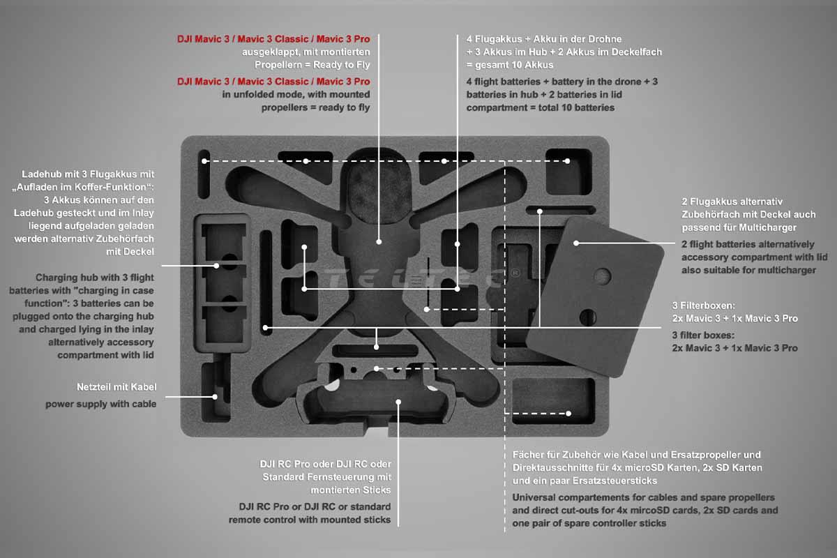 Der TOMcase Schutzkoffer, Mavic 3 Pro, XT505 "Ready To Fly" Carbon Edition ist ein großer Koffer mit extra viel Stauraum für DJI Mavic 3 Pro und Zubehör. Die Drohne findet in diesem Case in flugbereitem Zustand mit Propellern und Schutz Platz. Außerdem gibt es in der Hartschaumstoffeinlage noch Aussparungen für z.B. den DJI RC / RC Pro Controller, neun zusätzliche Akkus, ein 3-fach Ladehub mit Netzteil und Anschlusskabel, zwei Mavic 3 Classic ND-Filterboxen, eine Mavic 3 Pro ND Filterbox sowie 7 Fächer für z.B. Netzstecker, Kabel und Ersatzpropeller. Überdies gibt es auch noch Ausschnitte für ein Paar Ersatzsteuersticks, zwei SD-Karten bzw. Adapter und vier microSD-Karten. Der Koffer selbst ist sandfarben, die Einlage dunkelgrau,.
