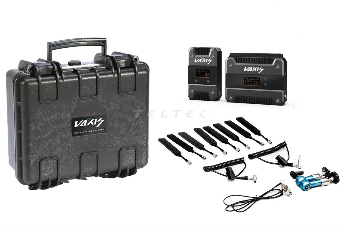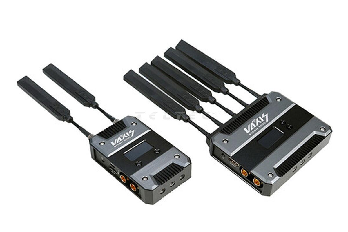 Das Vaxis Storm 3000 KIT TX/RX (Gold-Mount) ist ein drahtloses HD-Videoübertragungs-Set (1x Sender, 1x Empfänger) mit Gold-Mount. Die Reichweite beträgt dabei bis zu 1.000 m und hat eine Latenz von gerade einmal 1 ms. Die Antennen sind nicht verbaut, sondern befinden sich extern oben auf den Geräten und arbeiten im Frequenzbereich 5,1 bis 5,9 GHz mit einer Bandbreite von 40 MHz. Der mit Gold-Mount ausgestattete Empfänger kann Metadaten und Timecodes übertragen bekommen. Dazu wird SDI embedded Audio unterstützt. Außerdem können Videosignale mit bis zu 1920 x 1080 und 60p übertragen werden. Das Gerätepaar unterstützt zudem 4-Kanal embedded Audio mit 24 bit und 48 kHz. Die Storm 3000 sind auch mit dem ARRI Mini Modus und Replay ohne Verzögerung ausgestattet.