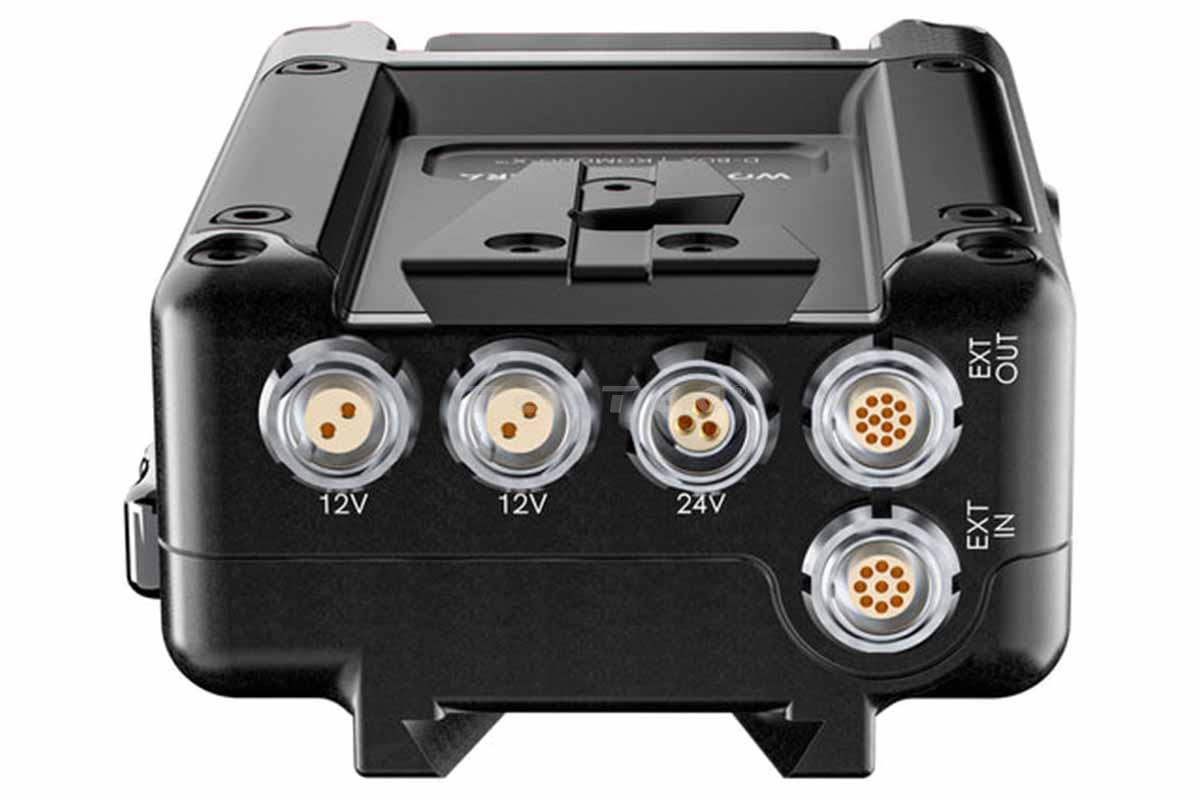Der Wooden Camera D-Box - V Mount (RED KOMODO-X) ist ein Stromversorgungsanschluss für die KOMODO-X und besitzt 2-polige 12V und 3-polige 24V-Stromversorgung sowie einen D-Tap-Anschluss. Die D-Box bietet bei Stromversorgung über den DC-Eingang und Anschluss einer On-Board-Batterie Hot-Swap-Fähigkeiten, als auch die Übernahme der Run/Stop Einstellung der Kamera bei Anschluss an den EXT-Port. Weitere Anschlussmöglichkeiten für zusätzliche Stromquellen als auch eine EXT-Out-Option befinden sich auf der Assistenzseite der Kamera.