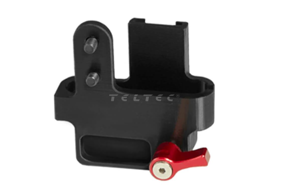 Diese Halterung wird an der Oberseite des Blackmagic Pocket Camera 4K Cage von Zacuto angebracht und ermöglicht die Aufnahme einer Samsung SSD. Die SSD wird in die Halterung eingeschoben und durch Drehen des roten Mini-Hebels fixiert. Die Montage auf dem Blackmagic Cage erfolgt mit zwei Sechskantschlüsseln.