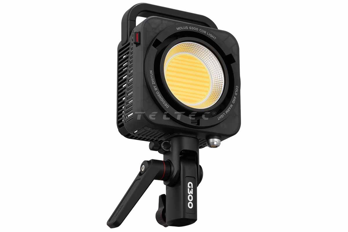 Das Zhiyun MOLUS G300 ist eine Bi-Color-LED Leuchte mit einem Farbtemperaturbereich von 2.700 K bis 6.500 K und einer Helligkeit von 20.300 Lux (@ 1m, ohne Reflektor) sowie 81.100 Lux mit Standardreflektor auf 1 Meter. Die MOLUS G300 ist per Kabel mit einem separaten Controller verbunden, der über zwei interaktive Tasten, zum Einstellen des Dimm- und Farbtemperaturbereichs, sowie einem Anzeigebildschirm verfügt. Zudem gibt es drei Lichtmodi. Der Normalmodus dient zum Einschalten des Lichts und erluabt das Einstellen der Helligkeit, während im Live-Modus die LED direkt nach dem Einstecken des Netzschalters aufleuchtet. Im Musikmodus reagiert die Leuchte auf den Musikbeat, um ein dynamisches Zuschauererlebnis zu erschaffen. Die LED verfügt mittels Boost-Funktion über eine maximale Ausgangsleistung von 500 W und verwendet das DynaVort Kühlsystem, um ein Überhitzen zu verhindern. Darüber hinaus ermöglicht das Bowens-Mount die Kombination mit verschiedenen Modifikatoren und Bowens-Mount-Zubehör, um vielfältige lichtformende Lösungen anzubieten.