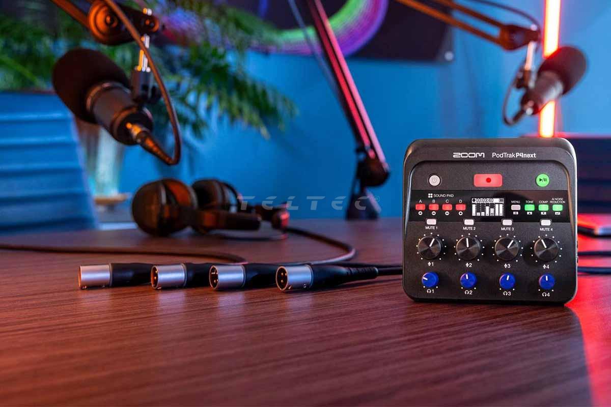 Der Zoom PodTrak P4next ist ein kompakter 4-Spur-Podcast-Recorder für professionelle Sprachaufnahmen und mobile Content-Produktion. Mit vier XLR-Eingängen, KI-gestützter Rauschunterdrückung und integriertem Audio-Interface bietet er Studioqualität im handlichen Format. Ideal für Podcaster, Interviewer und Teams, die auch unterwegs klaren, sendefertigen Klang benötigen.