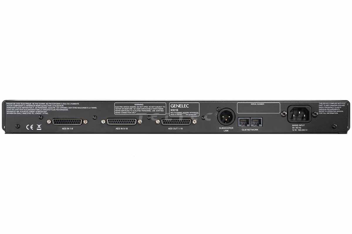 Das Mehrkanal-Interface Genelec 9301B ermöglicht den Betrieb der Genelec Subwoofer der 7300 Serie über AES/EBU. Die einzelnen Kanäle werden zu den Lautsprechern durchgeschliffen. Gleichzeit werden alle Kanäle über den Link-Ausgang zum Subwoofer übertragen. Dadurch können Mehrkanal-Setups mit bis zu 16 Kanälen realisiert werden.