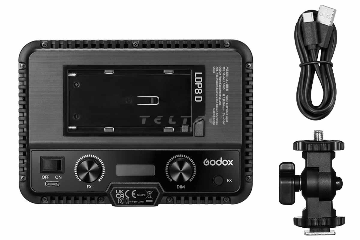 Die Godox LDP8D ist eine kompakte, dimmbare Tageslicht LED-Leuchte die auf dem Blitzschuh einer Kamera montiert werden kann. Die Farbtemperatur der Leuchte ist konstant bei 5.600 K und im Menü sind 8 vorprogrammierte anpassbare Lichteffekte abrufbar.