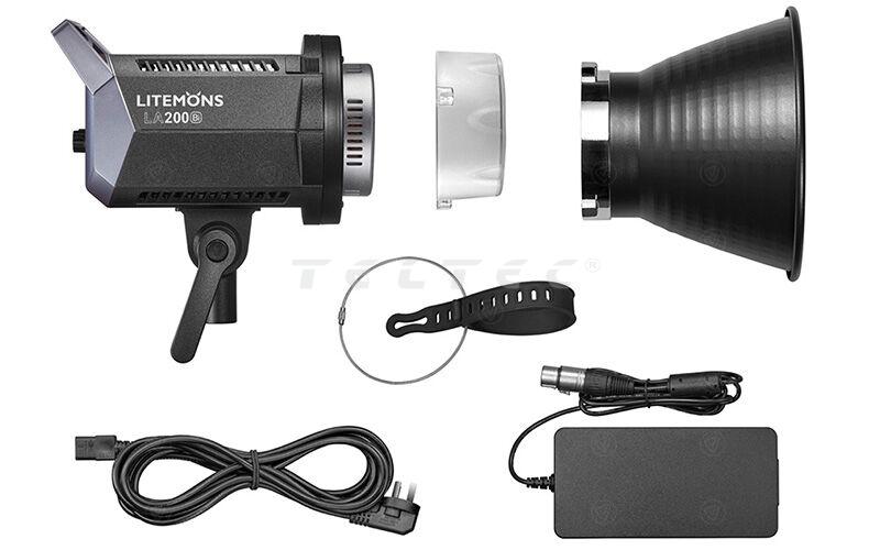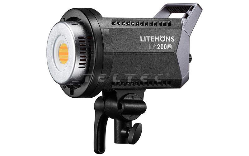 Die Godox LITEMONS Bi-Color LED Leuchte LA200Bi ist eine professionelle und dimmbare Bi-Color COB LED-Leuchte mit einer Farbtemperatur von 2.800 bis 6.500 K (+/- 200 K) sowie einer Leistung von bis zu 79.200 Lux (5.600 K/1 m, mit Reflektor). Darüber hinaus verfügt sie über über einen Farbwiedergabeindex von CRI ≥96 und TLCI ≥97. Die Steuerung der LA200Bi erfolgt manuell oder via Bluetooth App mit einer Reichweite von bis zu 30 m. Dies umfasst die Einstellung zu Helligkeit, Farbtemperatur und FX-Effekten. Zu den 11 verfügbaren FX-Lichteffekten zählen u.a. Flash1/2/3, Storm1/2/3, TV, kaputte Lampe, Kerze, Feuer und Feuerwerk. Die Helligkeit ist stufenlos zwischen 0% und 100% regulierbar. An der Rückseite der Leuchte ist ein LC-Display integriert, das zur Anzeige der Dimmung in Prozent sowie der Farbtemperatur dient. An der Vorderseite befindet sich eine Bowens Zubehörhalterung, sodass entsprechende Godox Zubehörteile mit Bowens-Bajonett verwendet werden können.