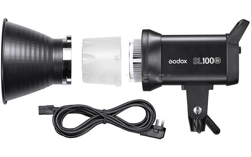 Die Godox SL100Bi ist eine dimmbare 100 W Bi-Color LED Leuchte mit einem Farbtemperaturbereich von 2.800 bis 6.500 K. Der Abstrahlwinkel beträgt dabei 120° und die Lichtintensität (auf 1 m mit Reflektor) 32.100 Lux. Darüber hinaus erreicht die COB LED Leuchte Farbwiedergabewerte von CRI ≥ 96 und TLCI ≥ 97. Die Steuerung erfolgt via Godox Ligt App, die optional erhältliche Funkfernbedienung RC-A6 oder manuell an der Leuchte. Des Weiteren sind 11 Lichteffekte integriert, zu denen: Lightning I, II und III, Flash, Conference, Paparazzi, TV, Broken Bulb, Candle, Fire, Firework zählen.