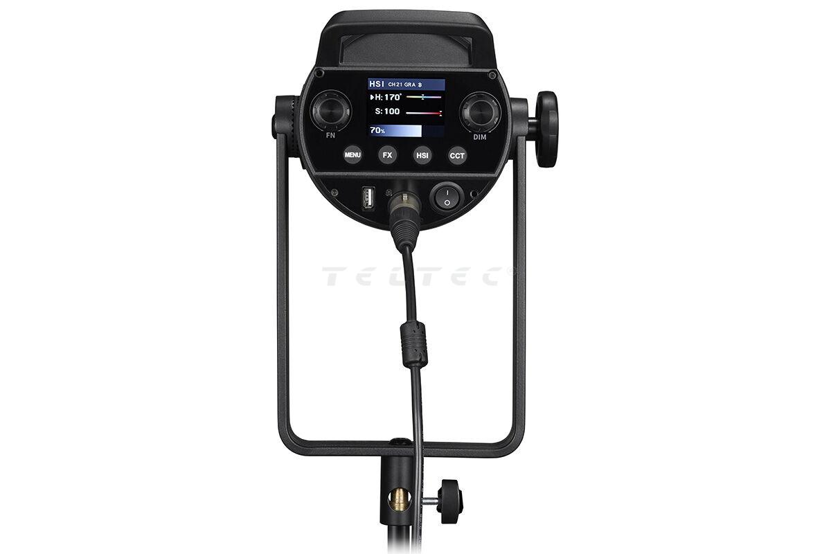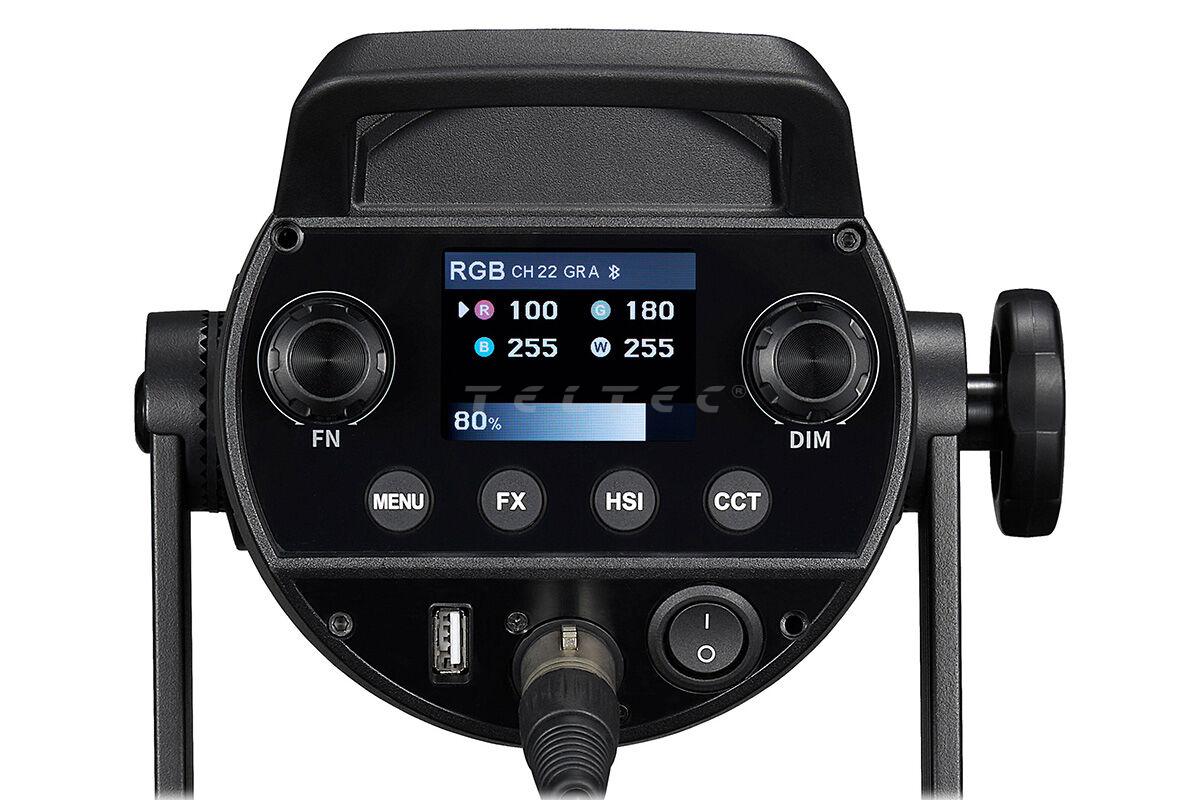 - Steuerung über Bedienelemente an der Leuchte, die kostenlose Godox Light-App für Android und iOS, Wired-DMX oder die optionale Funkfernbedienung RC-R9