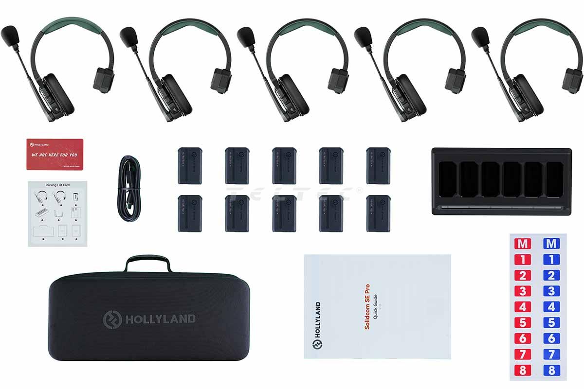 Das Hollyland Solidcom SE Pro 5S ist ein 5-Personen Headset-Intercom-Bundle mit Geräuschunterdrückung. Das Hollyland Solidcom SE Pro 5S ist ein 5-Personen Headset-Intercom-Bundle mit Geräuschunterdrückung. Mit einer Übertragungsreichweite von bis zu 400 m eignen sich die Headsets ideal für den Einsatz z.B. an Filmsets oder in großen Studios, wo sie bis zu 10 Stunden durchhalten. Die Dual-Mikrofon-Geräuschunterdrückung sorgt dabei für klare Stimmenübertragung. Die Headsets sind untereinander schon werkseitig gekoppelt und daher sofort einsatzbereit - dank wasserabweisender Eigenschaft auch bei leichtem Regen. Über den USB-C-Anschluss können die Akkus in weniger als 3 Stunden wieder vollständig aufgeladen werden. Im Paket sind eine 6er-Ladestation sowie 2 Akkus pro Headset dabei. Für Updates über Computer liegt ein USB-A-auf-USB-C-Kabel bei. Darüber hinaus sind auch Zahlensticker dabei, um die Headsets zur besseren Zuteilung zu nummerieren.