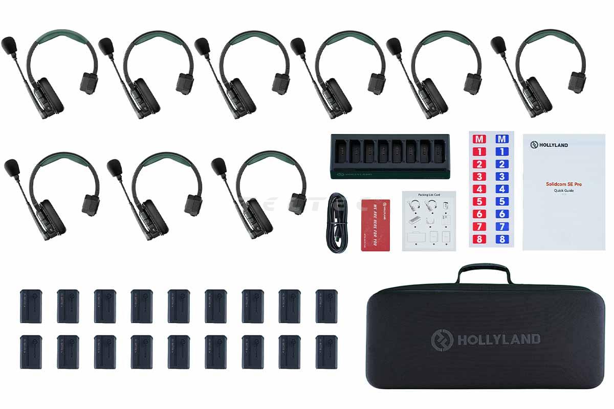 Das Hollyland Solidcom SE Pro 9S ist ein 9-Personen Headset-Intercom-Bundle mit Geräuschunterdrückung. Das Hollyland Solidcom SE Pro 9S ist ein 9-Personen Headset-Intercom-Bundle mit Geräuschunterdrückung. Mit einer Übertragungsreichweite von bis zu 400 m eignen sich die Headsets ideal für den Einsatz z.B. an Filmsets oder in großen Studios, wo sie bis zu 10 Stunden durchhalten. Die Dual-Mikrofon-Geräuschunterdrückung sorgt dabei für klare Stimmenübertragung. Die Headsets sind untereinander schon werkseitig gekoppelt und daher sofort einsatzbereit - dank wasserabweisender Eigenschaft auch bei leichtem Regen. Über den USB-C-Anschluss können die Akkus in weniger als 3 Stunden wieder vollständig aufgeladen werden. Im Paket sind eine 8er-Ladestation sowie 2 Akkus pro Headset dabei. Für Updates über Computer liegt ein USB-A-auf-USB-C-Kabel bei. Darüber hinaus sind auch Zahlensticker dabei, um die Headsets zur besseren Zuteilung zu nummerieren.