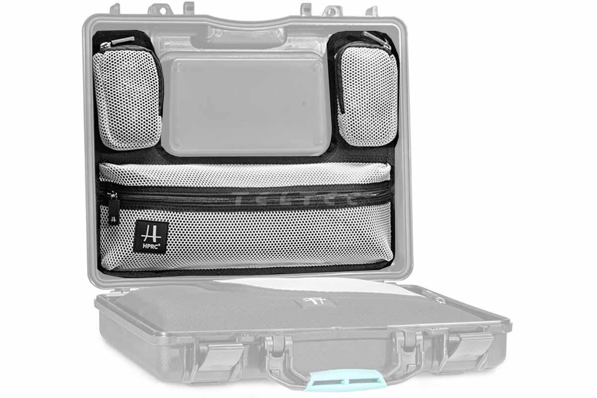 Das HPRC Organizer Kit for HPRC2580 ist eine zweiteilige Einlage für den HPRC2580-Koffer. Sie kann mittels angebrachter Klebestreifen in die Kofferschale eingefügt werden und bietet 1x3 und 1x2 Taschen, wovon letztere eine Laptoptasche mit Zusatzfach ist. Die Beschaffenheit des Taschenstoffes verhindert sofortiges Durchsickern versehentlich darauf verschütteten Wassers. Der rückseitige Stoff ist überdies beständig gegen Schimmel, Chemikalien und Witterung.