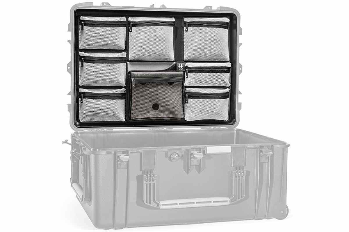 Das HPRC Organizer Kit for HPRC2780W / 2800W ist ein zusätzlicher Verstauraum für den HPRC2780W und 2800W-Koffer. Er kann mittels angebrachter Klebestreifen in die Kofferschale eingefügt werden und besteht aus insgesamt 8 Taschen, wovon eine entnehmbar und mit einem Schultergurt ausgestattet ist. Dahinter findet sich zudem Platz für ein Laptop oder Tablet, welches mit einem verstellbaren Stretch befestigt werden kann. Die Beschaffenheit des Taschenstoffes verhindert sofortiges Durchsickern versehentlich darauf verschütteten Wassers. Der rückseitige Stoff ist überdies beständig gegen Schimmel, Chemikalien und Witterung.