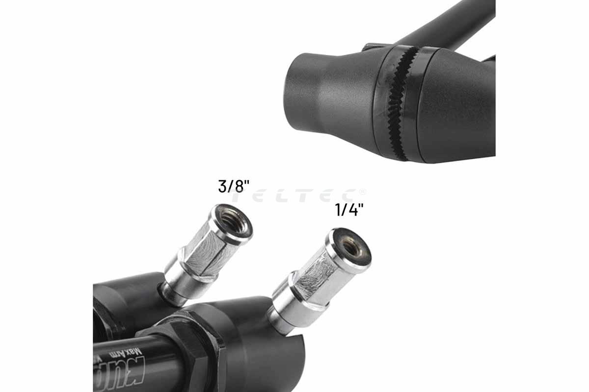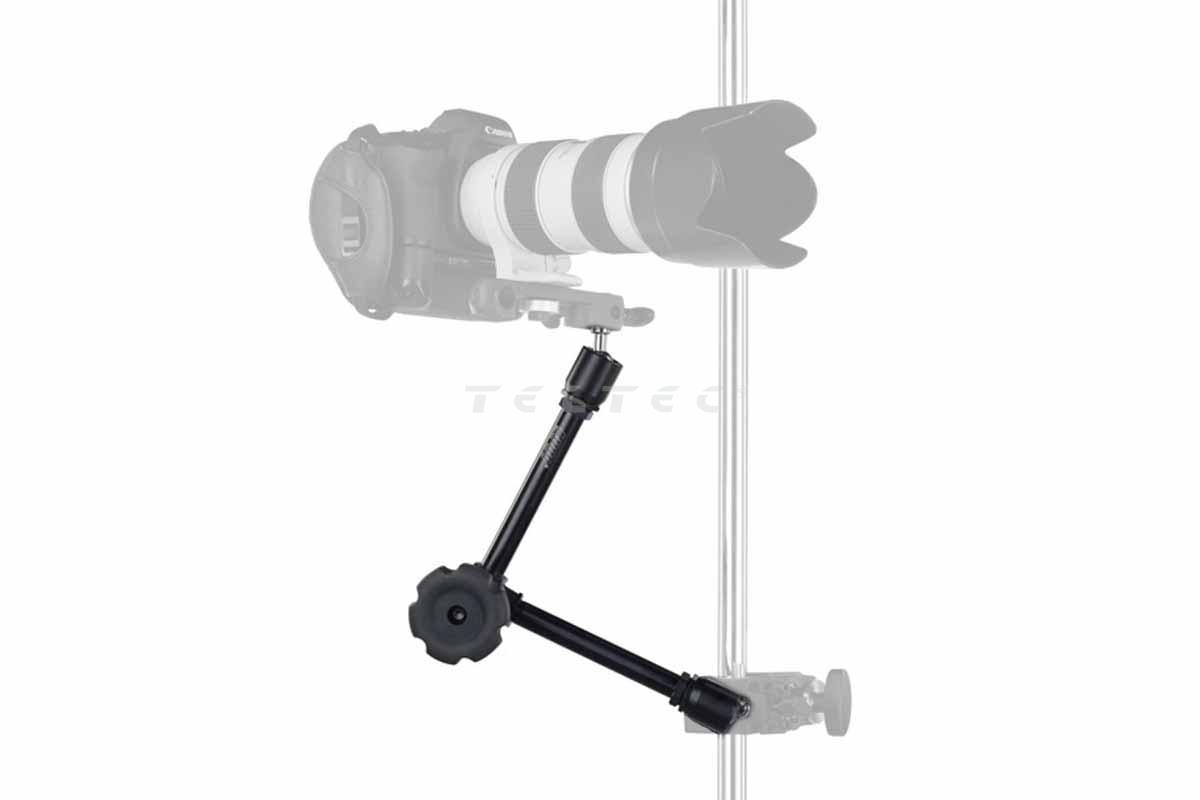 Der Kupo KCP-101W Max Arm ist ein vielseitiger Gelenkarm mit zwei 16-mm-Zapfen und speziellen Reibscheiben, die mit Anti-Rutsch-Rosetten ausgestattet sind, um ein Verrutschen zu verhindern. Die beiden 16-mm-Zapfen verfügen über ein Kugelgelenk, die um 360° drehbar sind und um 90° abgewinkelt werden können. Zudem ist ein Zapfen mit einem 3/8"-16-Innengewinde und der andere Zapfen mit einem 1/4"-20-Innengewinde ausgestattet. Für zusätzlichen Rotationsschutz sorgen sechs gefräste Flachstellen an jedem Zapfen, um ein Verdrehen des montierten Equipments zu verhindern. Das zentrale Ellenbogengelenk ist ebenso um 360° drehbar und sorgt für vielseitige Einstellungsmöglichkeiten. Mittels dem gummierten Handrad werden alle drei Gelenke gleichzeitig arretiert.