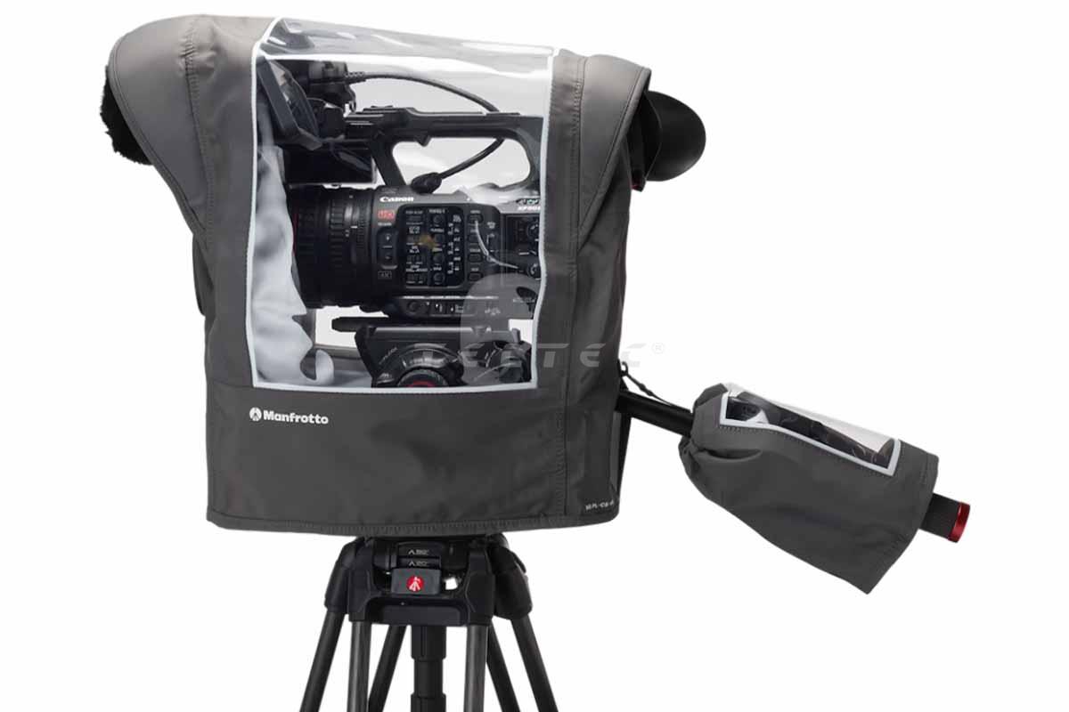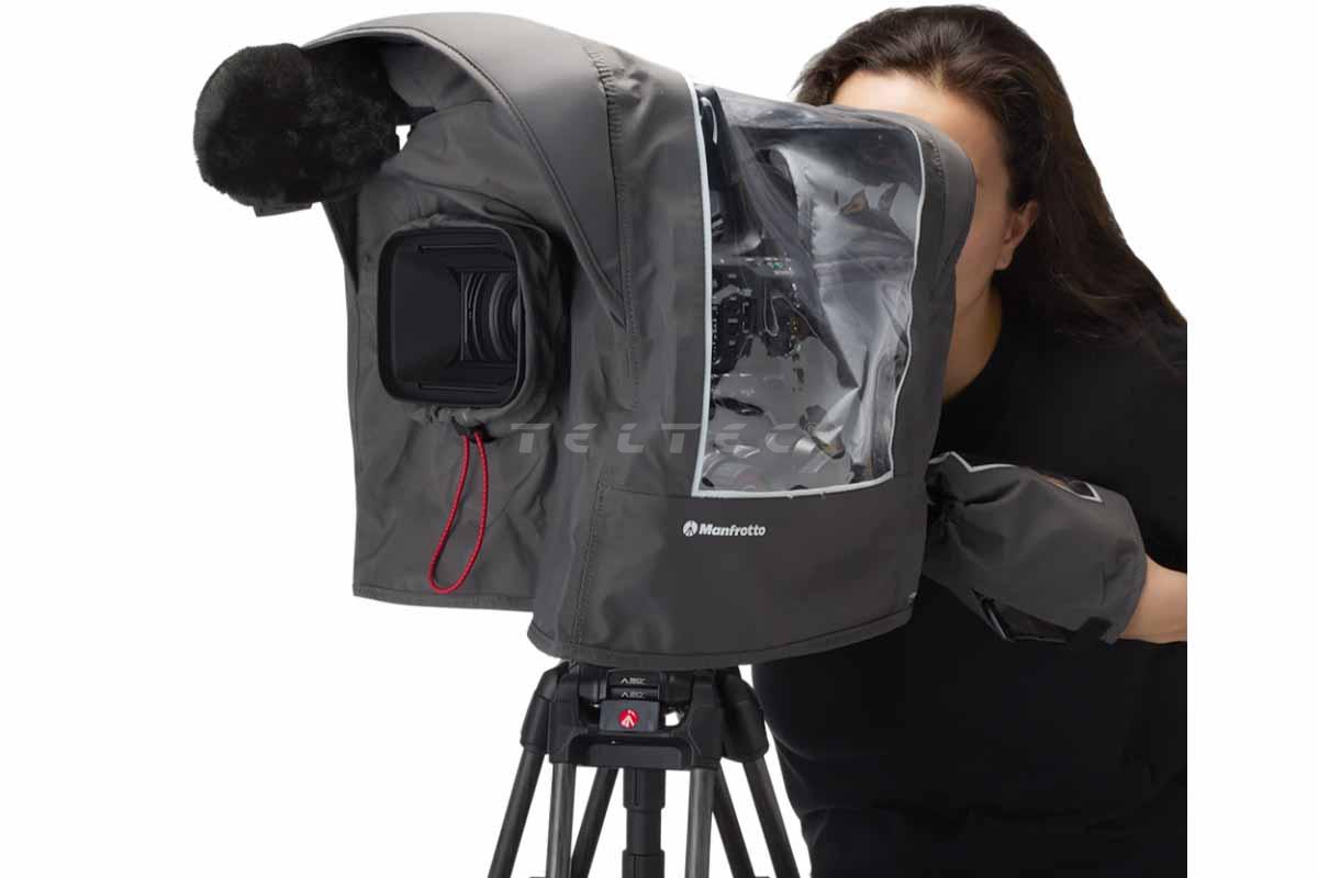 Das Manfrotto Pro Light Cineshield M/L ist ein Regenschutz der mittelgroße und große Camcorder samt Zubehör vor jeglichen Witterungsbedingungen schützt. Der Regenschutz ist mit einem großen transparenten Fenster ausgestattet, das die mühelose Steuerung der Kamera erlaubt. Zusätzliche Visiere an der Objektiv- und Sucheröffnung bieten Schutz vor Regentropfen, während die Kordelzüge für einen sicheren Sitz auf der Kamera sorgen. An der Oberseite der Kamera ist eine Klettverschlussöffnung, sodass die Montage von Zubehör wie Mikrofonen oder Sendern möglich ist. Zudem enthält der Lieferumfang eine kleine Abdeckung, welche die Fernbedienung an der Schwenkstange des Stativs schützt.