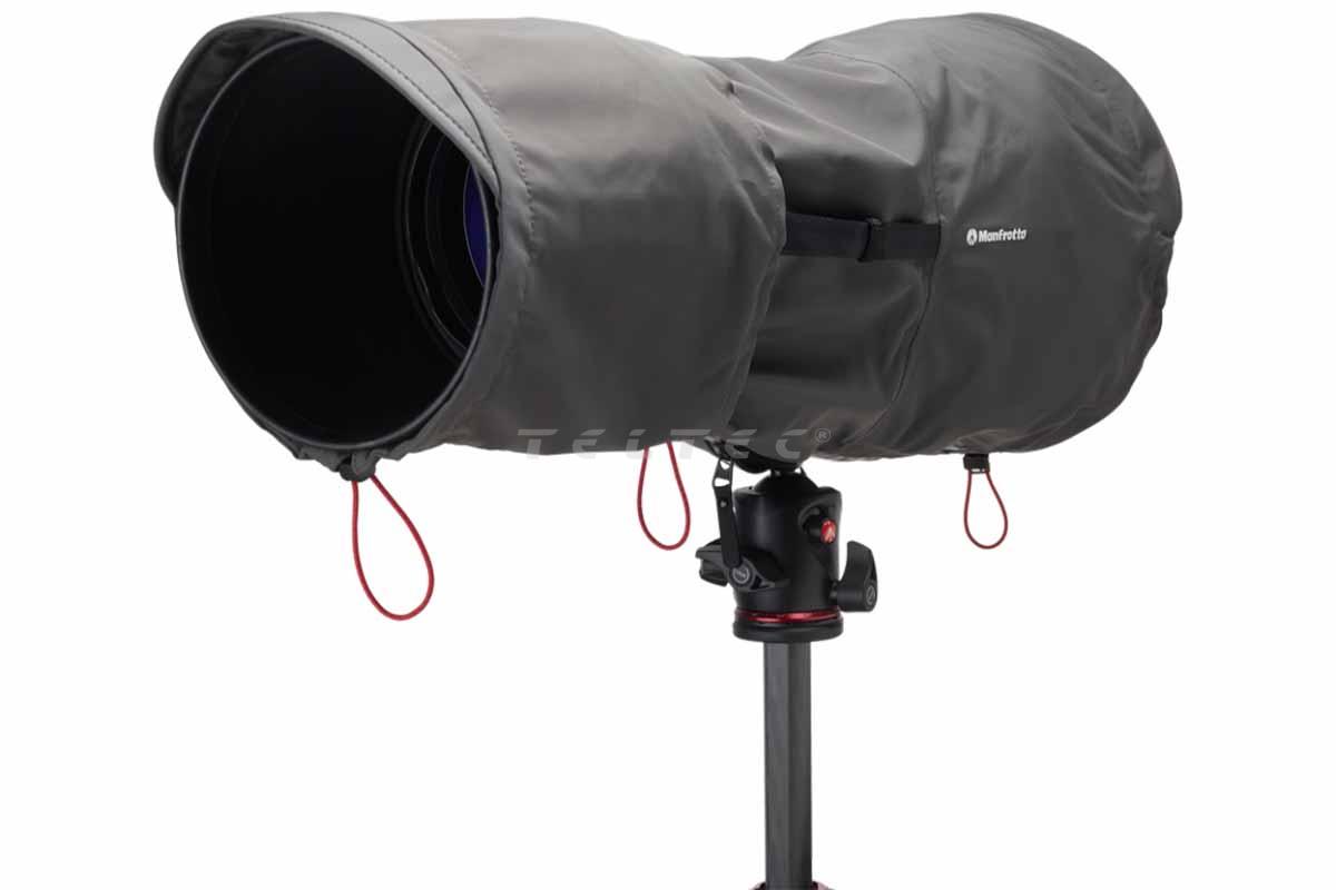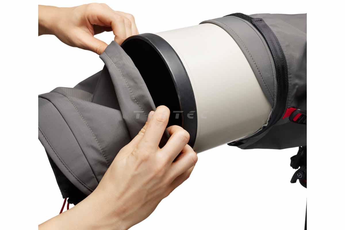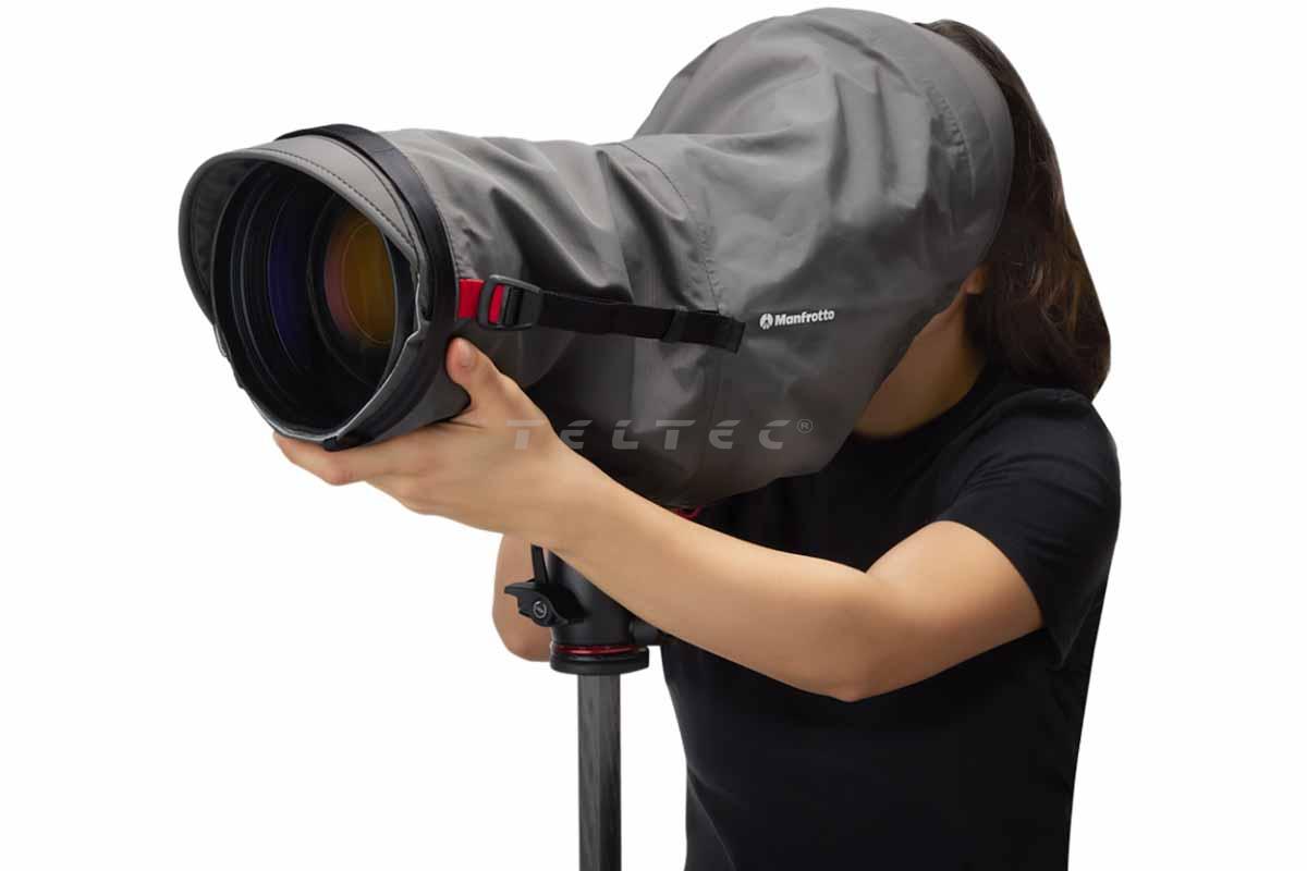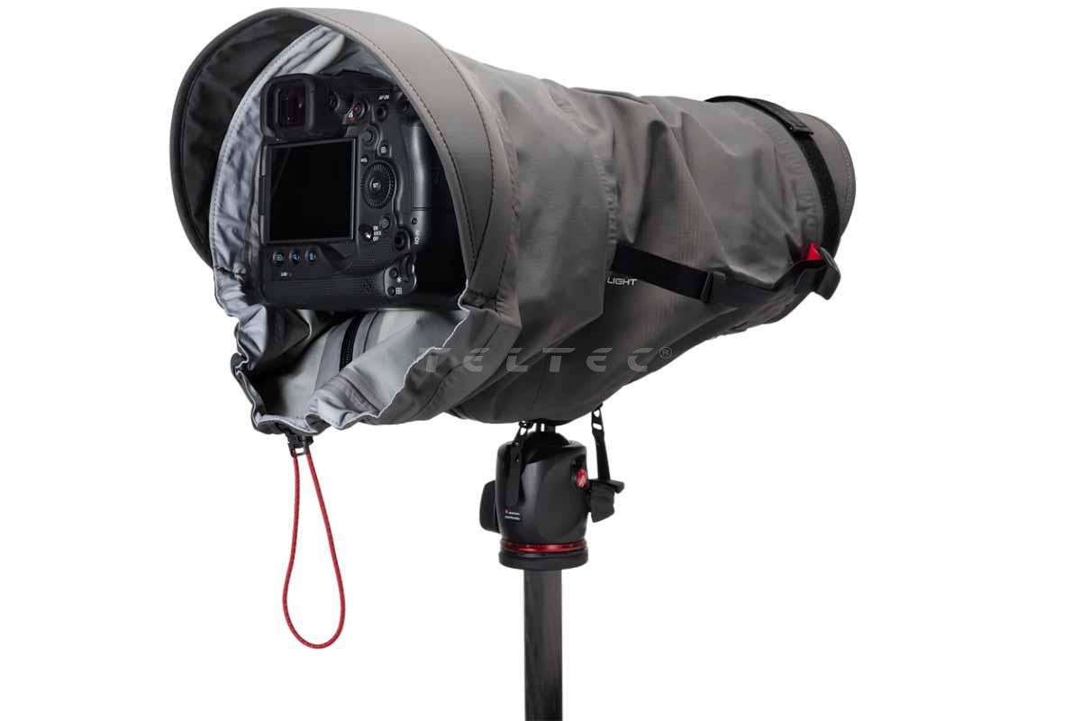 Das Manfrotto Pro Light Teleshield ist ein Regenschutz der für Kameras mit einem angeschlossenem Super-Tele-Objektiv geeignet ist, um diese vor jeglichen Witterungsbedingungen zu schützen. Der Regenschutz ist im Durchmesser und der Länge anpassbar, sodass er für eine Vielzahl an DSLR- oder spiegellosen Kameras mit einem angeschlossenem Teleobjektiv kompatibel ist. Darüber hinaus sind ein wasserdichter Reißverschluss sowie zwei Abziehvorrichtungen an der Unterseite integriert, sodass die Kamera auch bei aufgesetztem Regenschutz nahtlos auf einem Stativ befestigt werden kann. Im Lieferumfang ist eine Erweiterung für den Regenschutz enthalten, die zusätzlichen Schutz für Objektive mit einer Gegenlichtblende bietet. Das Pro Light Teleshield ist aus einem 3-lagigem Material mit Wärmeversiegelung gefertigt und hat minimale Nähte, sodass ein umfassender Schutz vor Feuchtigkeit gegeben ist.