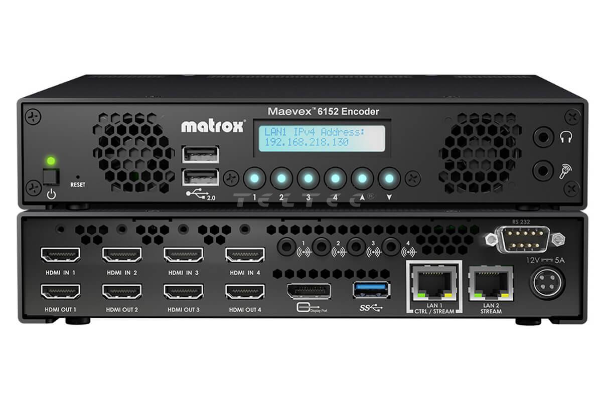 Der Maevex 6152 Encoder von Matrox ist ein Vierfach-HDMI Videokodierer, der die Erfassung und Kodierung von 4K-Eingängen ermöglicht. Das Gerät bietet sicheres Streaming, mehrfaches Chroma-Sub-Sampling, anpassbare Kodierungsparameter, Pass-Through ohne Latenz und Compositing in einer praktischen, leisen und stromsparenden Einheit.