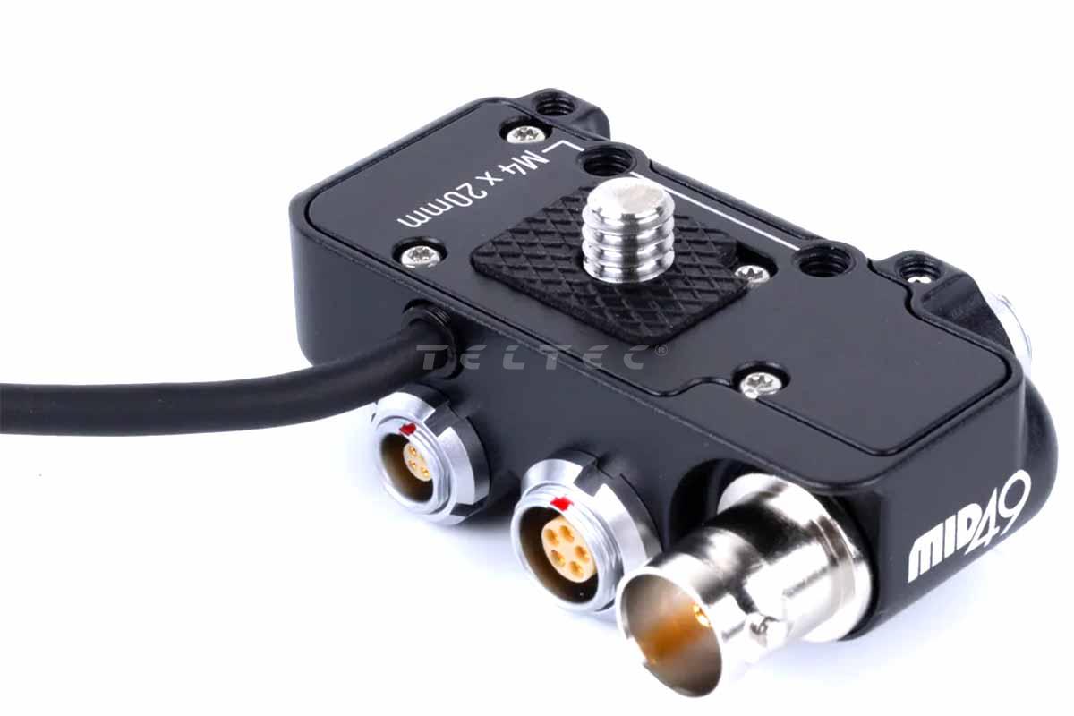 Die MID49 M49-BOB-EB1 EXT Breakout EB-1 (RED Komodo, Komodo-X, V-Raptor) wandelt den 9-poligen 0B LEMO-kompatiblen EXT-Anschluss der Kamera in Industriestandard-Anschlüsse um.