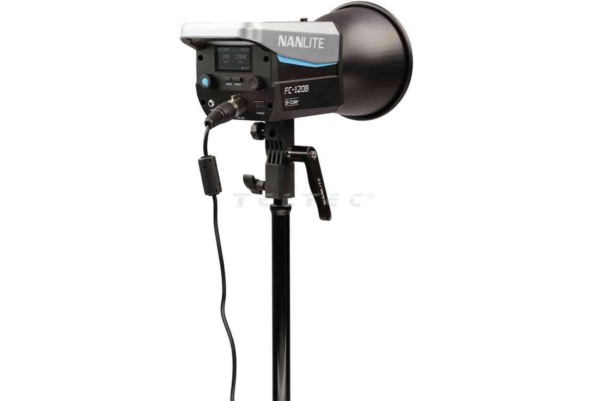 Die Nanlite FC-120B ist eine BiColor-LED Studioleuchte mit einer Nennleistung von 145 W. Die Leuchte bietet einen CCT-Bereich von 2700 K - 6500 K. Die Leuchtstärke beträgt auf einem Meter 17.450 Lux (mit 45° Reflektor, bei 5600 K). Die Leuchte bietet eine hohe Farbwiedergabequalität und ermöglicht dank der integrierten 12 Beleuchtungseffekte kreative Möglichkeiten am Set. Dank des mitgelieferten Bowens-Mount ist die Leuchte kompatibel mit einer Vielzahl an Zubehören. Der Abstrahlwinkel der FC-120B beträgt 120°, bei Verwendung des Reflektors beträgt der Abstrahlwinkel 45°. Die Leuchte lässt sich von 100 % auf 0 % Dimmen, steuern lässt sich die Lampe OnBoard, per Fernbedienung, über Bluetooth in Verbindung mit der NANLINK App oder DMX / RDM. Das geräuscharme Kühlgebläse ermöglicht einen Dauerbetrieb, das Gebläse lässt sich in mehreren Stufen einstellen, FULL SPEED, LOW SPEED, OFF und SMART (hier wird die Lüftergeschwindigkeit automatisch in Abhängigkeit von der Umgebungstemperatur geregelt). Bei durchschnittlich mit nur 20 dBa im SMART-Modus ermöglichen auch Videoaufnahmen im Nahbereich.