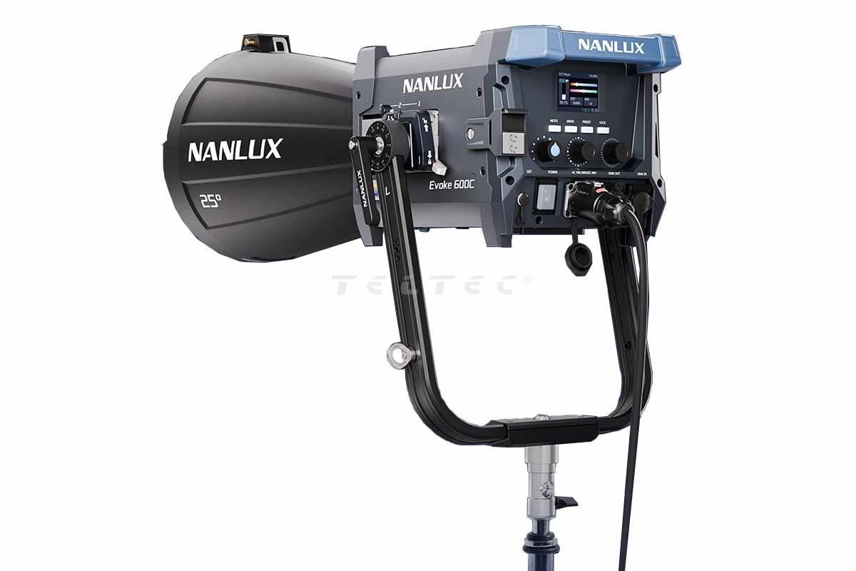 Der NANLUX Evoke 600C ist ein vollfarbiger LED-Spot der Evoke-Serie für professionelle Beleuchtungs-Setups. . Der Evoke 600C nutzt die Nebula C8 Color Light Engine für präzise Farbwiedergabe und bietet einen sehr großen CCT-Bereich von 1.000 – 20.000 K mit ±200 G/M-Feinabgleich, ein All-in-One-Design ohne externes Vorschaltgerät, sowie den neuen BE-Mount (Bowens-kompatibel). Für die Steuerung stehen u. a. On-Board, DMX/RDM, LumenRadio CRMX, App (NANLINK) und ein kabelgebundener Controller zur Verfügung. Der Leuchtkopf ist IP66-geschützt und dimmt linear von 0–100 % in 0,1 %-Schritten.