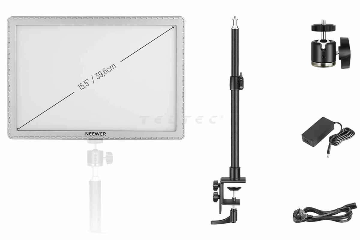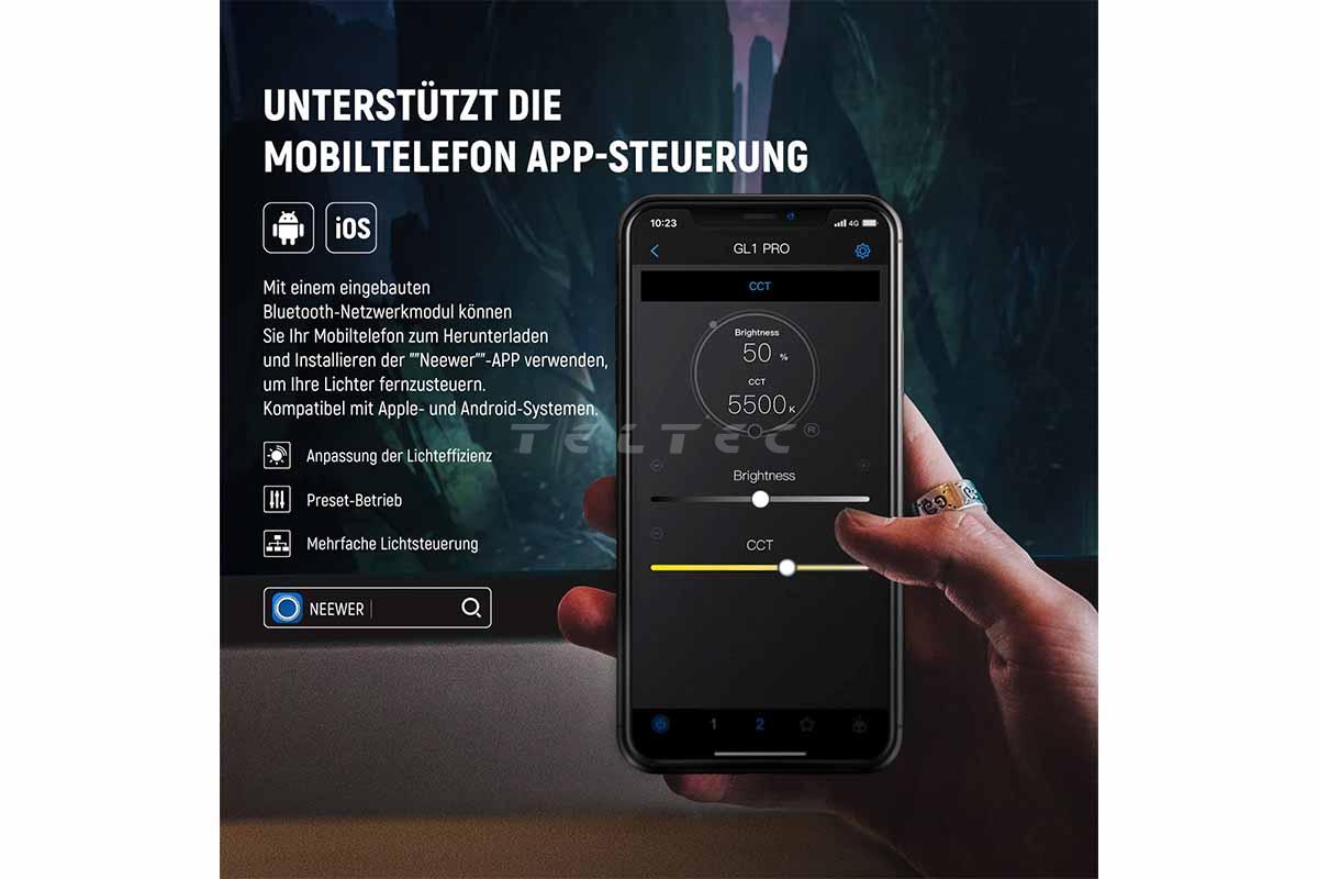 Die Neewer GL1 pro ist eine leistungsstarke 45-Watt Bi-Color LED Flächenleuchte, die speziell für Streamer und Gamer entwickelt wurde. Mit ihrem 15,5-Zoll-Panel und 192 Premium-LEDs bietet sie eine gleichmäßige und weiche Beleuchtung, die sich ideal für Videoaufnahmen oder Livestreams eignet. Die Farbtemperatur ist stufenlos von 2.900 bis 7.000 K einstellbar, während die Helligkeit in 1%-Schritten von 0 bis 100% angepasst werden kann. Dank eines hohen CRI von 97+ sorgt die Leuchte für eine präzise und natürliche Farbwiedergabe. Mit einer maximalen Helligkeit von 3.700 Lux (0,5 m) bietet sie ausreichend Leuchtkraft. Für die Steuerung stehen verschiedene Optionen zur Verfügung: über eine App für iOS und Android, Bluetooth, 2,4 GHz Funksteuerung mit Gruppenfunktion oder direkt über das Elgato Stream Deck. Das lüfterlose Design sorgt für einen geräuschlosen Betrieb, und die externe Stromversorgung ermöglicht zuverlässige Leistung bei langen Streams.