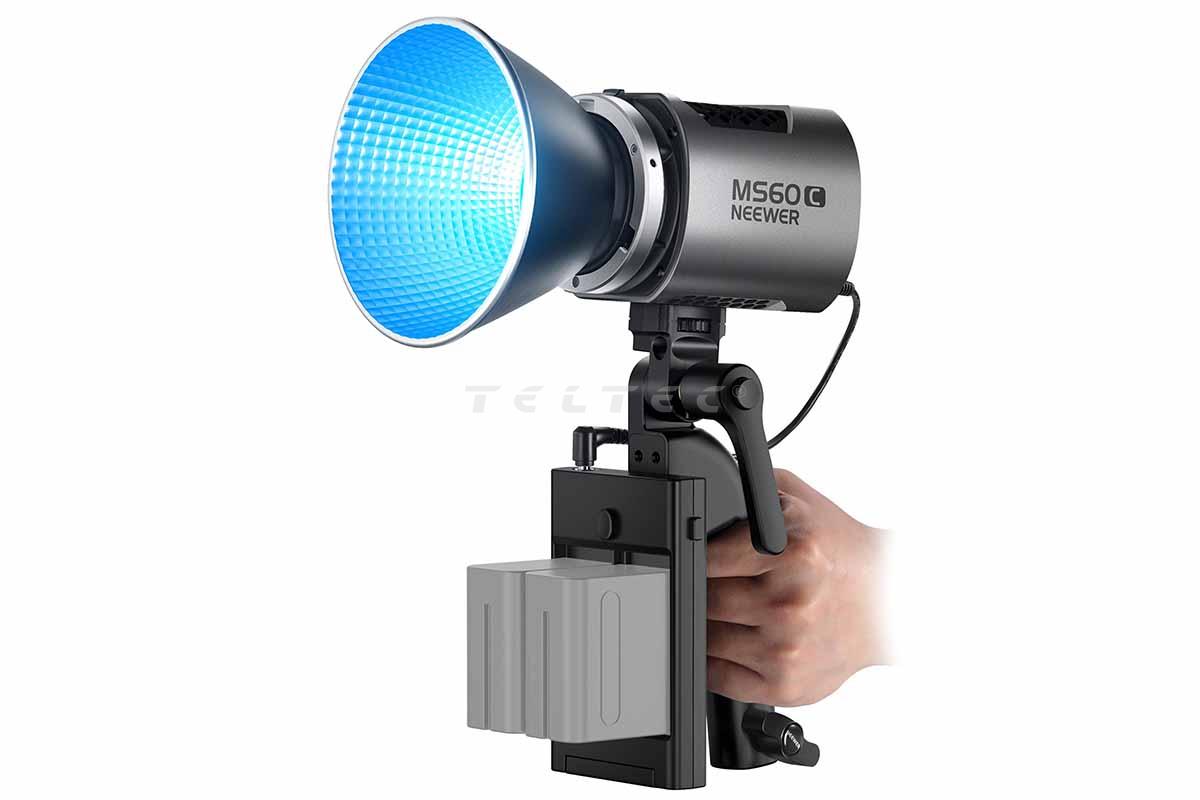 Das Neewer MS60C ist ein 65 Watt RGB LED Dauerlicht und bietet eine beeindruckende Leistung und Vielseitigkeit für professionelle Foto- und Videoaufnahmen. Mit einer Farbtemperatur von 2.700 bis 6.500 K und einem hohen CRI von 97+ sorgt es für exakte Farbwiedergabe. Die Helligkeit lässt sich in 1%-Schritten von 0 bis 100% dimmen, mit einer maximalen Helligkeit von 41.000 Lux (0,5 m). Das Licht bietet verschiedene Modi wie CCT, HSI, RGBCW und FX, einschließlich 18 Szeneneffekten wie Explosion und Polizeiauto. Es kann über eine App (iOS/Android) oder eine 2,4 GHz Funksteuerung mit einer Reichweite von 15 m gesteuert werden. Der Standardreflektor mit silberner Innenbeschichtung sorgt für eine gleichmäßige Lichtverteilung. Das robuste Aluminiumgehäuse ist mit einem Bowens-Adapter kompatibel. Der abnehmbare Handgriff ist 180° schwenkbar, und der leise Lüfter (28 dB) garantiert einen geräuscharmen Betrieb. Das Dauerlicht kann mit Netzteil oder optionalen Akkus betrieben werden.