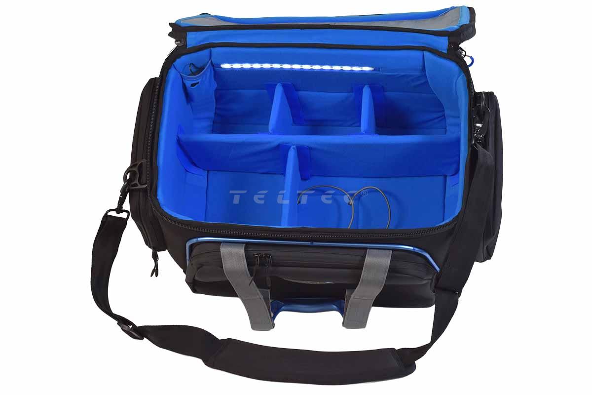 Der Orca OR-13 ist eine Schultertasche für Videokameras. Sie verfügt über drei große Außentaschen und ist im Innern mit blauem Netzgewebe ausgestattet. Ein äußerer Aluminiumrahmen und ein innerer Wabenrahmen bieten umfassenden Schutz, während der LED-Streifen im Innern für die Beleuchtung sorgt. Der gepolsterte Schultergurt sorgt für einen hohen Tragekomfort.