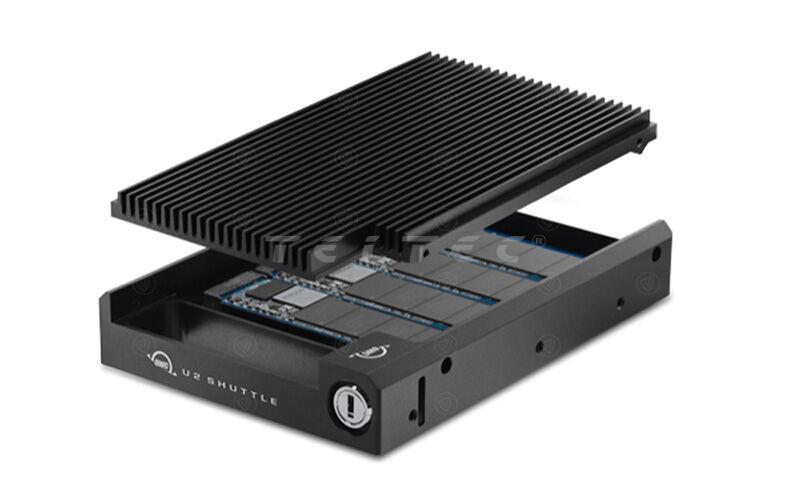 Das OWC U2 Shuttle ist ein 3,5" internes Leergehäuse mit U.2 Anschluss, für bis zu vier M.2 NVMe SSDs, z. B. für OWC Mercury Helios 3S*, ThunderBay Flex 8 oder Mercury Pro U.2 Dual.