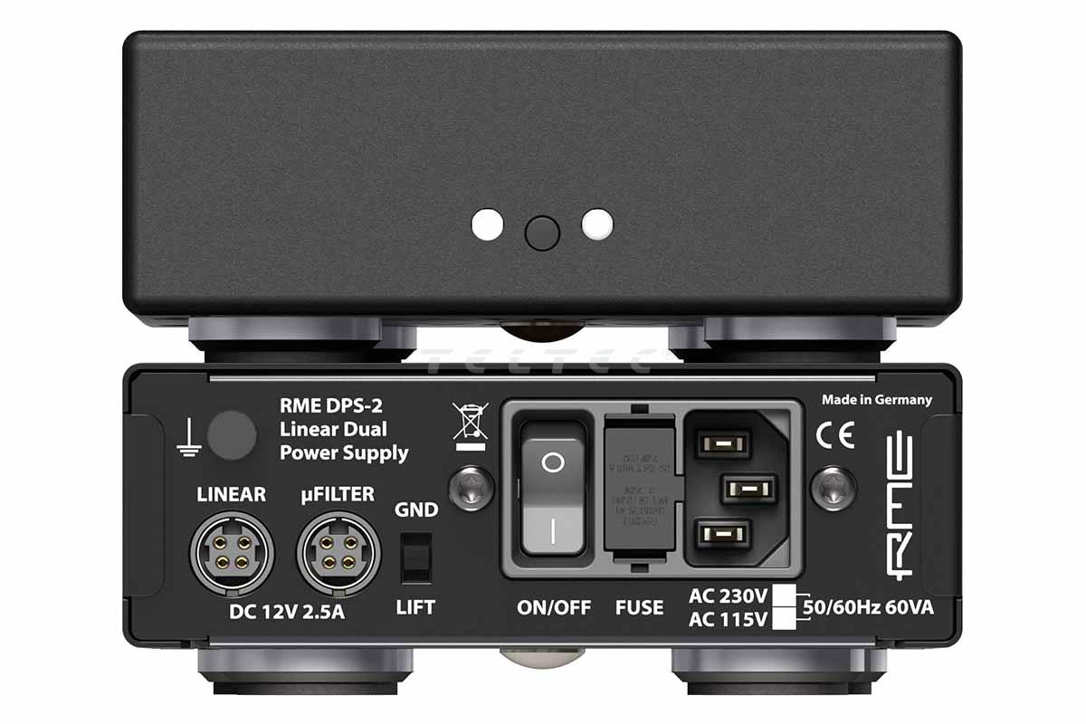 Das RME DPS-2 ist ein Linearnetzteil für Audioanwendungen mit µFilter-Technologie. Es verfügt über mehrere Funktionen, darunter zwei Ausgänge mit individueller Filterung. Sein Gehäusedesign und die Frontplatte orientieren sich an der ADI-2 Serie von RME und bieten somit ein innovatives Schaltungsdesign auf halber Rackbreite. Der Linear-Ausgang stellt einen klassischen Gleichstromausgang dar, der jedoch mit mehrstufigen passiven und aktiven Filtern ausgestattet ist. Hierzu gehören eine 30.000 µF-Kondensatorbank, eine Ferrit-Drossel und ein aktives Ausgangsfilter mit einem Hybrid-Spannungsregler. Der zweite Ausgang basiert auf RMEs µFilter-Technologie, die das vorgefilterte Signal des Linear-Ausgangs mithilfe hoch effizienter aktiver Filter weiter verarbeitet. Dadurch wird ein äußerst sauberes DC-Ausgangssignal erzeugt, das praktisch keine Störungen aufweist, selbst in nur geringfügigen Mikrovoltbereichen. Zusätzlich integriert der Ausgang Sensortechnologie, die die Ausgangsspannung direkt am DC-Stecker des mitgelieferten DC-Spezialkabels misst und regelt. Dies gewährleistet eine äußerst niedrige Ausgangsimpedanz und Load-Regulation. Somit wird eine saubere Ausgangsspannung von +12,0 V mit 2,5 A sichergestellt und lastabhängige Spannungsabfälle nahezu vollständig eliminiert. Durch die Kombination eines zweistufigen HF-Netzfilters und eines DC-Netzfilters auf der AC-Seite bietet das DPS-2 eine optimale Leistung ohne Störgeräusche. Durch den Ground-Lift-Schalter kann die Masse des DC-Ausgangs bei Bedarf vom Schutzkontakt getrennt werden, um beispielsweise Brummschleifen aufzuheben. Dies hat keine Auswirkungen auf die Sicherheit, da der Schutzkontakt des Netzkabels weiterhin fest mit dem Gehäuse und der Erdungsklemme verbunden ist. Zudem ist das DPS-2 mit einer Erdungsschraube (GND Schraubklemme) ausgestattet, die es ermöglicht, andere Geräte zu erden oder eine alternative Erdung für die Audio-Stromversorgung zu nutzen.