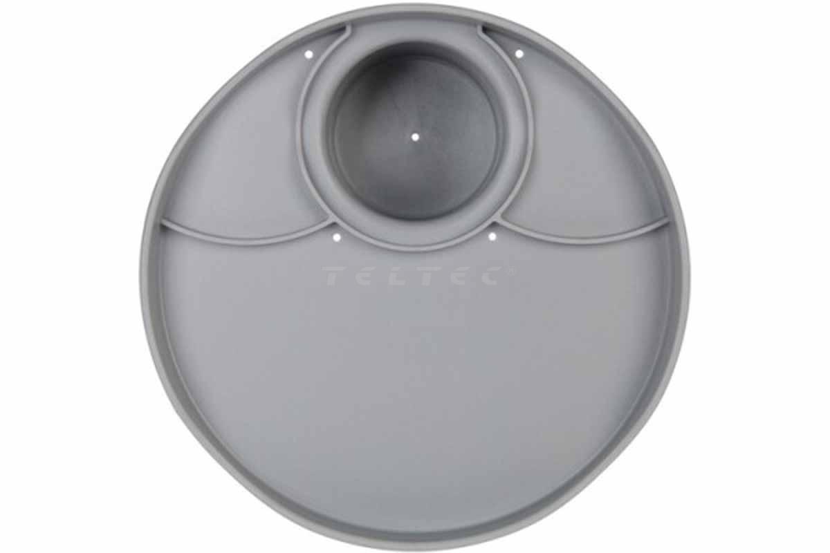 Die RoboCup Plate: Gray ist ein ca. ∅21,6 cm großer Teller mit 3-teiliger Fläche und Getränkehalterung. Die Plate wird mit ihrer eigenen Getränkehalterung auf den RoboCup gesteckt, sodass beim Einsatz dieser Erweiterung kein Platz verloren geht. Die Fläche für Speisen sind in einen großen Mittelteil und zwei gleichermaßen kleine Seitenteile eingeteilt. Insgesamt hat der Teller 5 Abflusslöcher, um verschüttete Getränke etc. besser ableiten zu können. Die RoboCup Plate hat eine glatte Beschichtung, welche leicht gereinigt werden kann, per Hand oder im oberen Fach einer Spülmaschine.