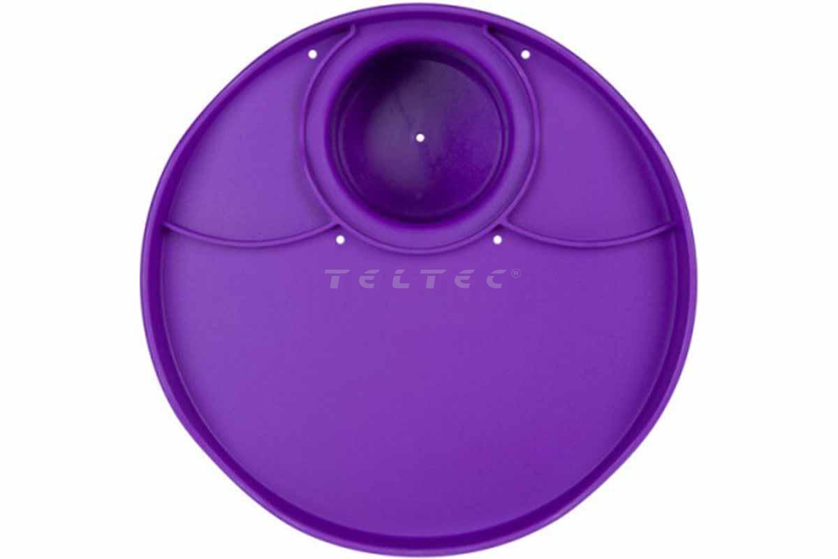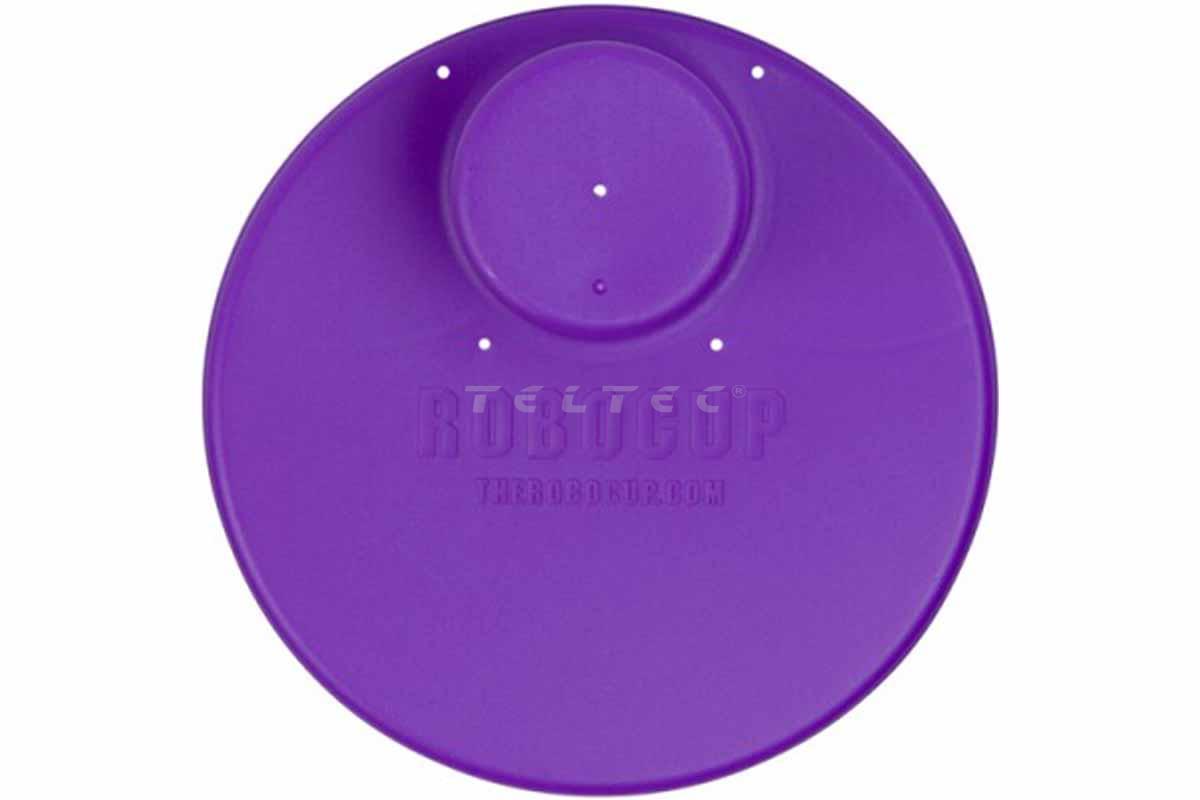 Die RoboCup Plate: Purple ist ein ca. ∅21,6 cm großer Teller mit 3-teiliger Fläche und Getränkehalterung. Die Plate wird mit ihrer eigenen Getränkehalterung auf den RoboCup gesteckt, sodass beim Einsatz dieser Erweiterung kein Platz verloren geht. Die Fläche für Speisen sind in einen großen Mittelteil und zwei gleichermaßen kleine Seitenteile eingeteilt. Insgesamt hat der Teller 5 Abflusslöcher, um verschüttete Getränke etc. besser ableiten zu können. Die RoboCup Plate hat eine glatte Beschichtung, welche leicht gereinigt werden kann, per Hand oder im oberen Fach einer Spülmaschine.