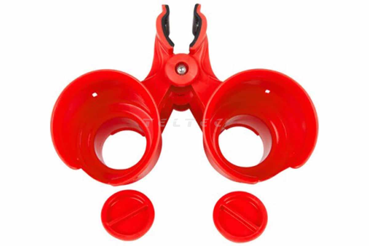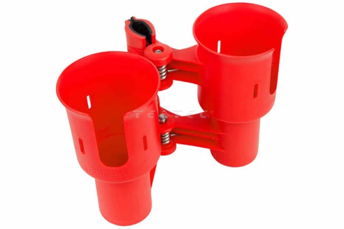 Der RoboCup Red ist ein Getränkehalter mit zwei Cups, den man an diversen Geräten montieren kann. Die starken federgestützten Klemmen können problemlos an flachen und runden Kanten von bis zu 50 mm Dicke geklemmt werden. Die Cups nehmen Dosen und Flaschen mit einem Durchmesser von ca. 50 bis 75 mm auf.