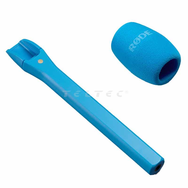 Mit dem Rode Interview Micro Blue Handadapter verwandelt man das Sendemodul des Rode Wireless Micro Funkmikrofon-Systems ganz einfach in ein drahtloses Reportagemikrofon. Das Sendemodul muss dazu nur in den Handadapter eingeschoben werden. Ein passender Schaumstoff-Windschutz ist im Lieferumfang enthalten.