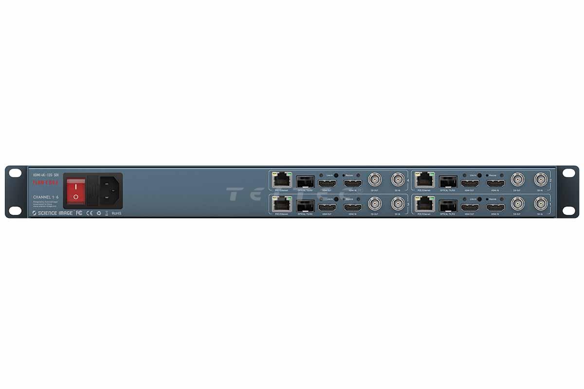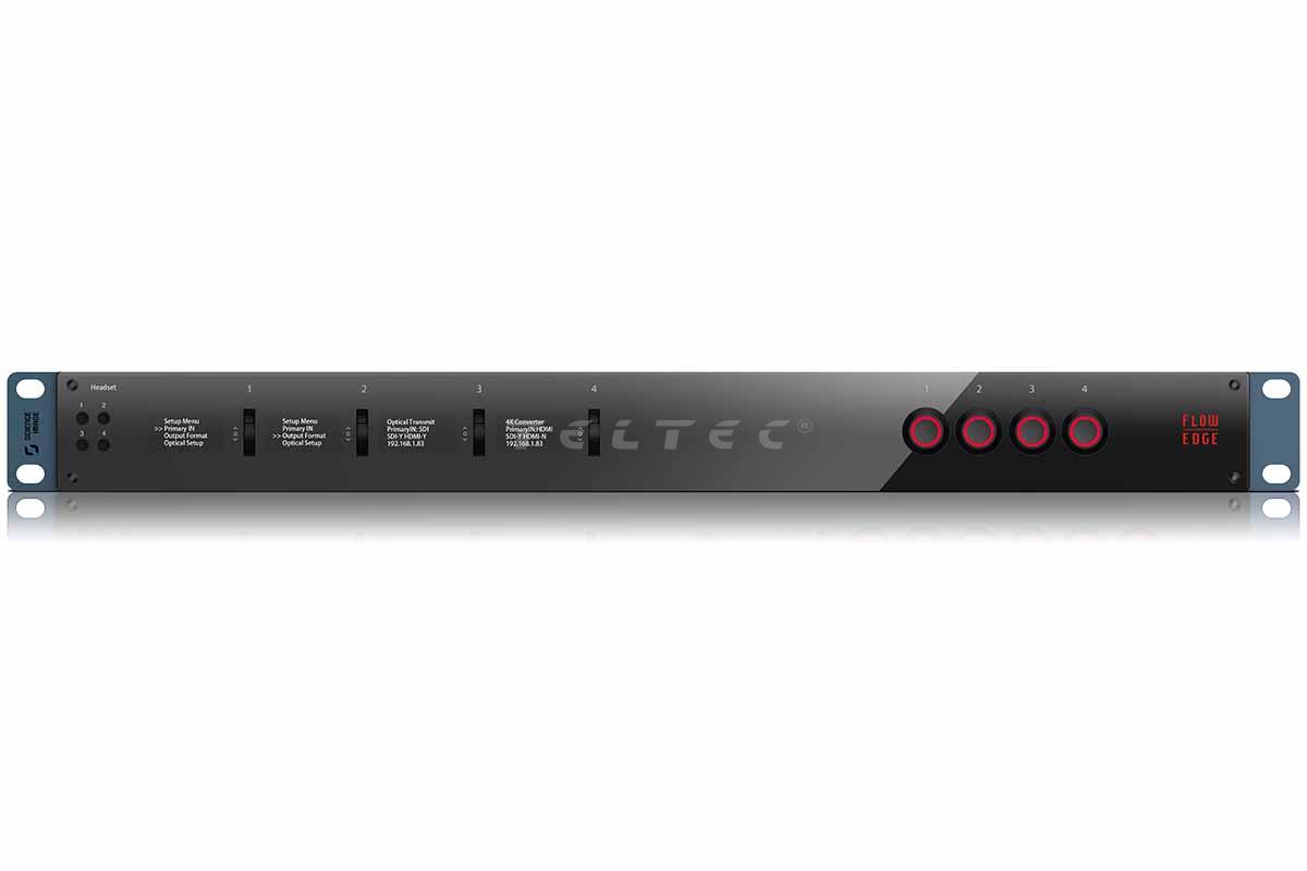 Das Science Image FLOW Edge SIFLED4 ist ein 4-Kanal UpDownCross-Konvertierer und optischer Transceiver. Er bietet rückseitig pro Kanal je einen PoE/Ethernet-, Line in-, optischen TX/RX-, HDMI IN- sowie OUT- und 12G-SDI IN- sowie OUT-Anschluss. Über diese lassen sich ein- und ausgehende Signale nach oben, unten oder über kreuz in über 35 andere Formate bis zu 2160p60 konvertieren. Zudem ist jeder Kanal vorderseitig jeweils mit eigenem 1,3" OLED Display, Menürad, 3,5-mm-Kopfhörer-Anschluss sowie einer Powertaste ausgestattet. Beim SIFLED4 gibt es vier Kanäle. Das FLOW Edge Gehäuse hat eine kompakte Größe von 1 Rack-Einheit (RU) und kurzer Tiefe.