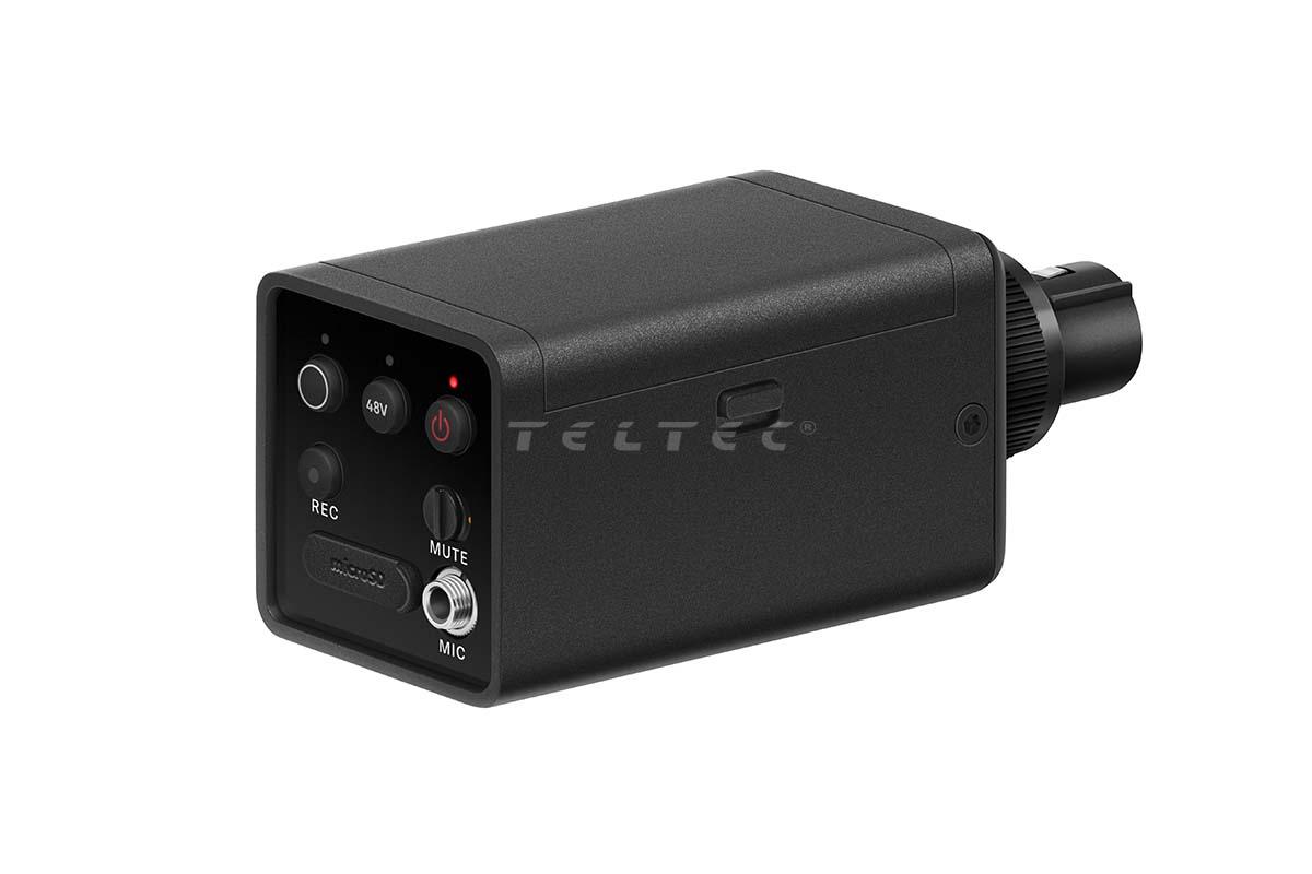 - Aufstecksender mit XLR- und 3,5-mm-Klinken-Eingängen, +48 V Phantomspeisung und Aufnahmemöglichkeit auf microSD-Karte