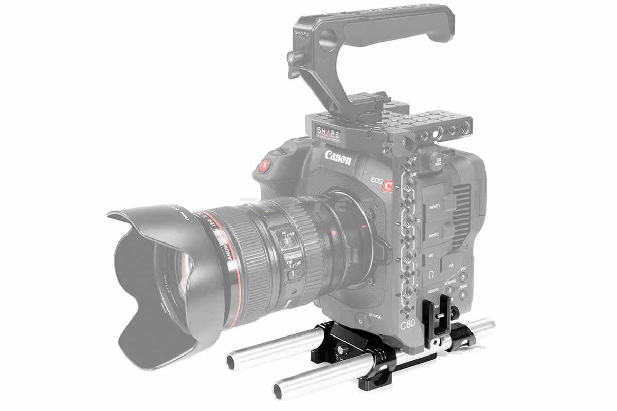 Die Shape ARCA Baseplate 15mm LWS für Canon EOS C80 umfasst eine 501 Adapterplatte, die unter dem Kameragehäuse befestigt wird und eine stabile Verbindung bietet. Mit der ARRI-kompatiblen Schwalbenschwanzplatte ist die Montage an einem Stativkopf möglich, während die 20 cm langen 15-mm-Rods die Möglichkeit bieten weiteres stangenbasiertes Zubehör anzubringen. Zwei Klemmen an der Vorderseite verhindern dabei ein Verrutschen.