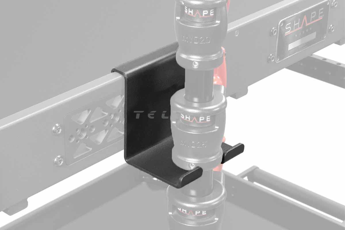 Das Shape Heavy Light Stand Hanger for Camera Cart ist eine Halterung für schwere Lichtstative, die aus Metallblech gefertigt sind und an den Seitenwänden oder dem oberen Regal des Shape Camera Carts montiert werden.