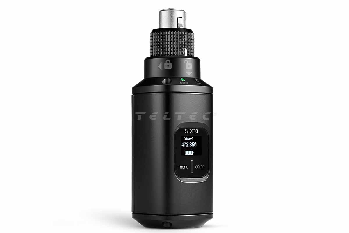 Das Shure SLXD3=-H56 ist ein digitaler Aufstecksender, der jedes XLR-Mikrofon in ein drahtloses Mikrofon wandelt. Dabei liefert der Sender eine 12 V/48 V Phantomspeisung, der die Verwendung von Kondensatormikrofonen erlaubt. Zudem können dynamische Mikrofone eingesetzt werden. Der Sender liefert ein transparentes, digitales 24-Bit-Audiosignal über eine stabile HF-Verbindung an einen digitalen SLXD4- oder SLXD5 Empfänger. Die Kopplung mit dem gewählten Empfänger erfolgt per "Scan and Sync"-IR-Verbindung.