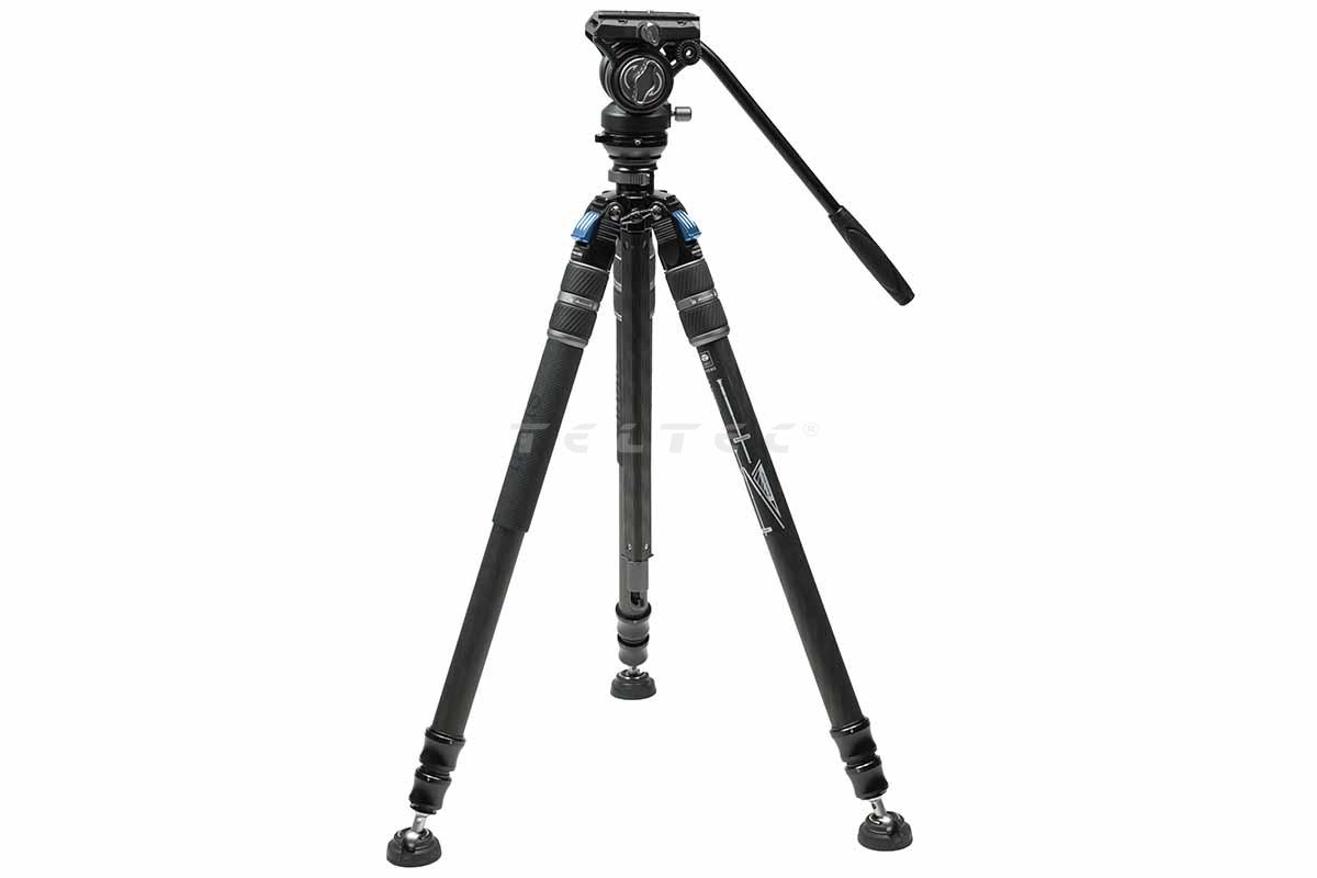 Das SIRUI SVS60+S3 Rapid System Stativ-Kit ist ein modulares Videostativ mit S3 Fluid-Videokopf. Das aus Karbon gefertigt Stativ ist leicht und robust und trägt bis zu 6 kg Last. Die Arbeitshöhe liegt bei mindestens 29,5 cm und höchstens bei 174 cm. Die ausfahrbare Mittelsäule lässt sich auch ganz herausnehmen und z.B. für Makroaufnahmen kopfüber wieder einlegen. Das Design der Beine erlaubt schnelle Höhenanpassungen, indem mit einer Drehbewegung der Verschlussmechanik gleich zwei Segmente auf einmal verschoben werden können. Mit dem Lösen des Klappverschlusses an der Schale kann diese im ±15°-Bereich bewegt werden, um trotz eines unebenen Grunds ein gerades Bild erhalten, ohne die Beine umstellen zu müssen. Ist der Verschluss festgezogen, kann der Ausgleichsmodus verwendet werden, welcher sich gut für horizontale Aufnahmen auf glattem Boden eignet. Die integrierte Wasserwaage hilft dabei. Darüber hinaus gibt es auch die Möglichkeit, mittels Knopfdruck alle drei Beine auf denselben Winkel festzulegen. Zur Wahl stehen dabei 78°, 50° und 21°. Das Stativ lässt sich jederzeit auch zum Einbeinstativ umfunktionieren. Auf dem Stativ kommt der S3 Fluid Videokopf zum Einsatz. Sein leistungsstarkes Dämpfungssystem ermöglicht geschmeidige Neigungen im Bereich von -50° bis +90°. Außerdem fährt der Kopf automatisch in die Ausgangsposition zurück, wenn der Griff losgelassen wird. Mit einem Knopfdruck kann zudem schnell zwischen einer Manfrotto und einer DJI RS Series QR Platte gewechselt werden (beide nicht enthalten).