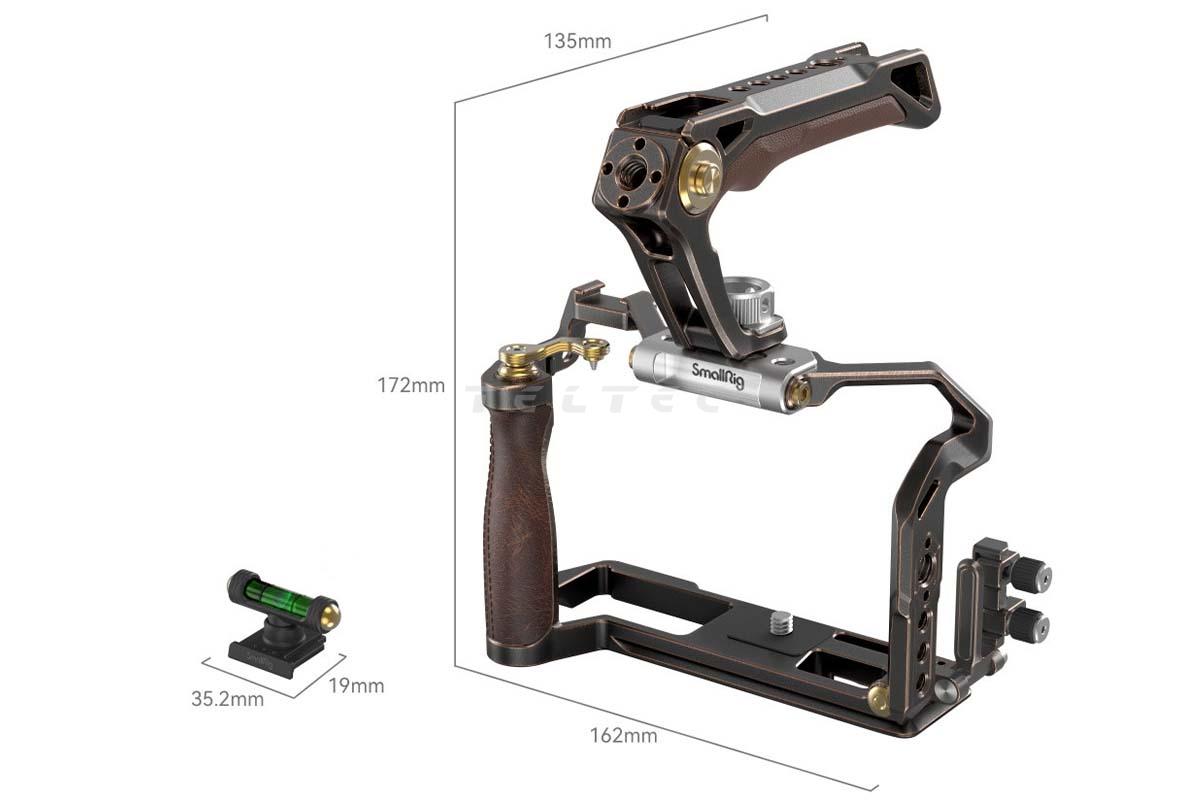 Das SmallRig 3872 Retro Handheld Cage Kit für FUJIFILM X-T5 ist ein Cage Kit für die Fujifilm X-T5 Kamera. Das Set besteht aus einem Kamerakäfig, einem oberen Handgriff, einer Kabeklemme, einer Blitzschuh-Abdeckung und weiterem kleineren Zubehör. Der Käfig mit Zubehör erleichtert Aufnahmen aus niedrigeren Winkeln, schützt die Kamera und bietet eine Vielzahl von Befestigungspunkten, wie z. B. 1/4''-20-Gewindebohrungen, ARRI 3/8" -16-Aufnahmebohrungen, Cold Shoe und NATO-Schiene. Die HDMI- und Typ-C-Kabelklemme mit neuem Press-and-Flip-Design verhindert ein versehentliches Trennen der Kabel und hält sie fest an ihrem Platz. Der obere Handgriff ist ergonomisch geformt und bietet ebenso mehrere Befestigungspunkte, wie 1/4''-20-Gewindebohrungen, ARRI 3/8"-16-Aufnahmebohrungen und Cold Shoes. Außerdem befindet sich in der Blitzschuhabdeckung eine Wasserwaage zur Kalibrierung. Der Käfig ist im Vintage-Schwermetall-Stil mit einem schwarzen Titankäfig mit Bronzekanten und goldenen Nieten gestaltet.