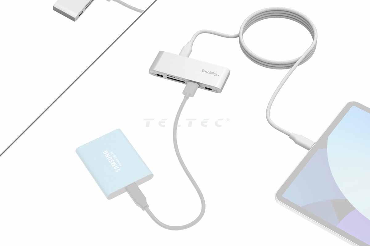 Der SmallRig 4746 5-in-1 Memory Card Reader for Travel Photography ist ein kompaktes 5-in-1-Hub mit USB-Anschlüssen und Speicherkartenplätzen. Mit seinen dualen 5 Gbps USB-C und USB-A Anschlüssen ist eine Übertragungsgeschwindigkeit von über 500 MB/s möglich. Der duale SD / TF Kartensteckplatz unterstützt gleichzeitiges Auslesen und Beschreiben, wobei die maximale Lesegeschwindigkeit bei 100 MB/s liegt. Der Kartenleser ist kompatibel mit allen gängigen SD-/microSD-Formaten sowie mit den Betriebssystemen Android, iOS, Windows und macOS. Zudem verfügt er über einen 65-W-PD-Eingang.