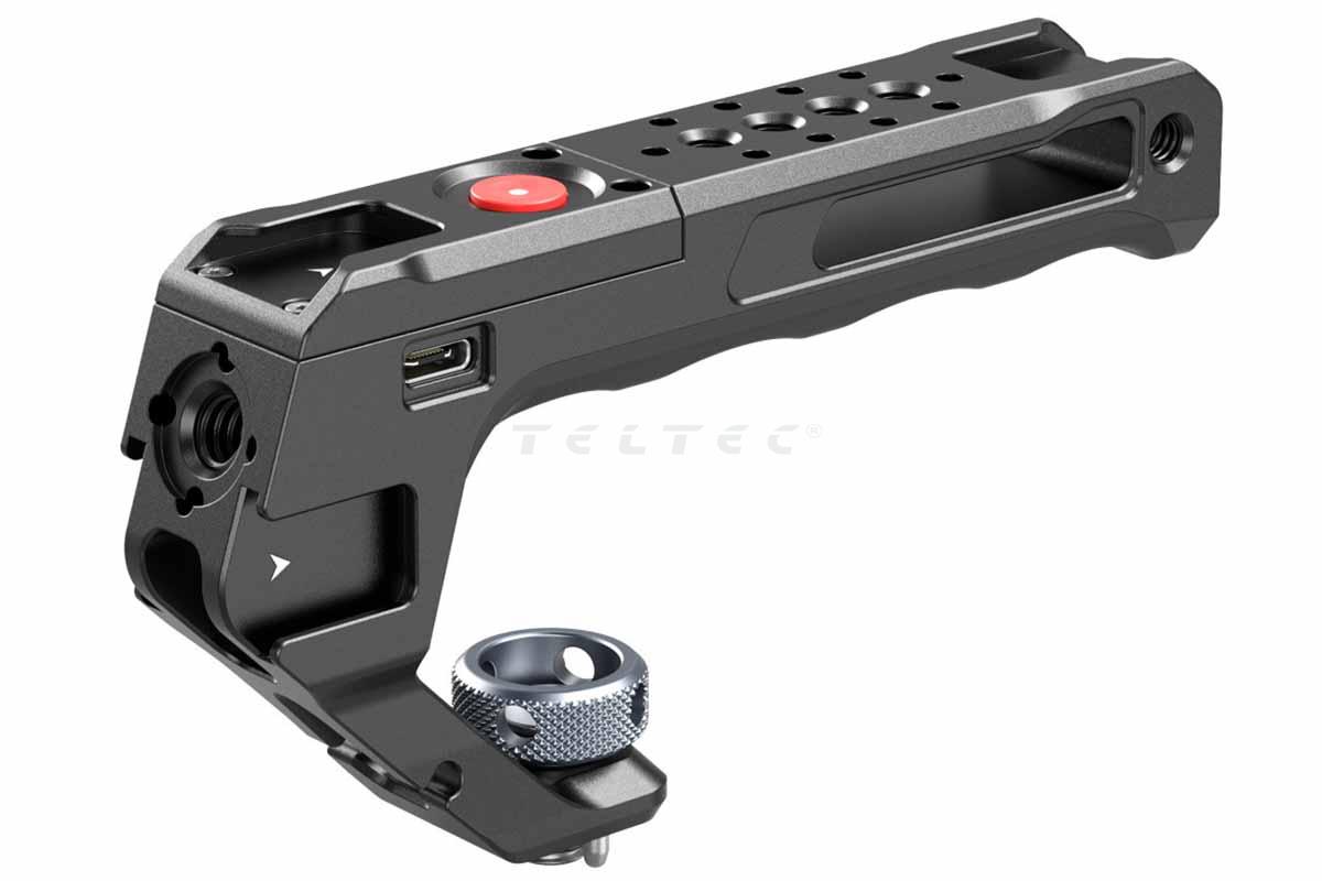 Das SmallRig 4927 Top Handle mit Rec Trigger (ARRI-Positionierungsschraube) ist ein Top-Handgriff, der mittels ARRI-Positionierschraube am Kamerakäfig befestigt wird und mittels integrierter Aufnahmetaste eine Aufzeichnung direkt starten kann. Im Lieferumfang sind verschiedene Steuerkabel enthalten, um ausgewählte Kameras von Sony, Canon, Fujifilm oder Panasonic) anzuschließen. Der Silikongriff bietet mehrere Befestigungsmöglichkeiten zu denen 3x Blitzschuhaufnahmen, 1/4"-20- und 3/8"-16-Gewindebohrungen zählen.