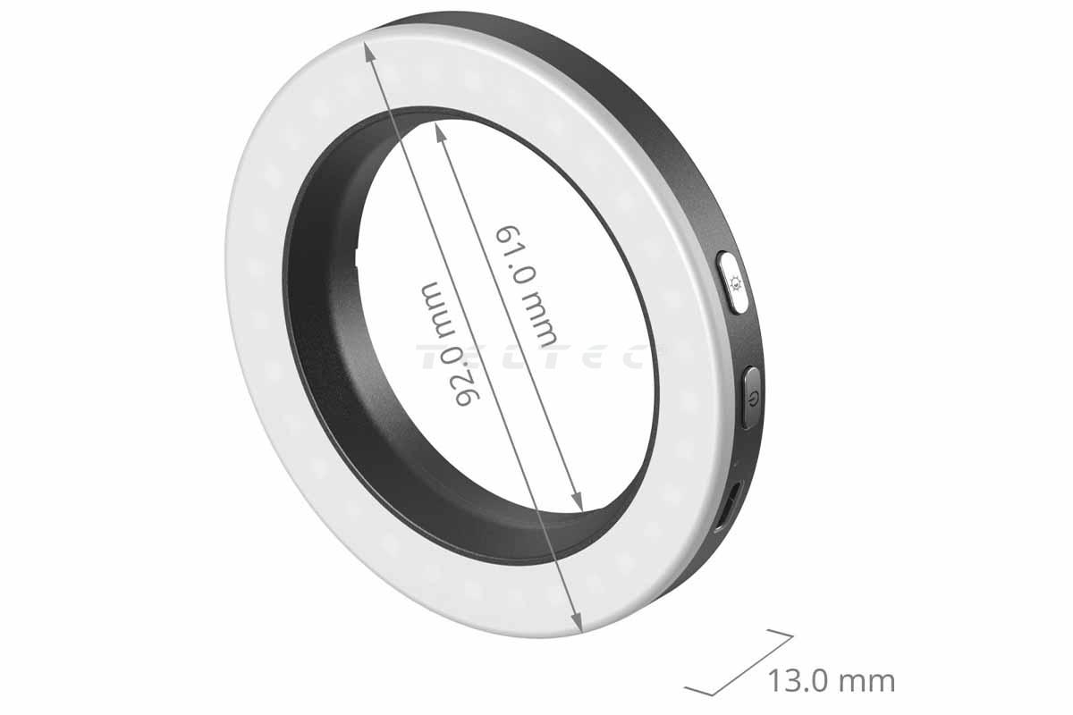 Das SmallRig 5203 Vibe P30 67mm Ring LED Video Light (Universal Threaded Filter Adapter Kit) ist ein Ring-Fülllicht mit Warmweiß und Kaltweiß für Smartphones. Mit dem beiliegenden 67-mm-Gewindeadapter kann das Ringlicht ganz einfach an die Hülle des Smartphones oder einen Käfig montiert werden. Alternativ geht es auch direkt auf ein 67-mm-Objektiv, sodass sich viele Möglichkeiten für den Einsatz ergeben. Das Licht kann in 3 Helligkeitsstufen (33 %, 66 %, 100 %) verstellt werden und somit Warm- über Normal- bis Kaltweiß abdecken. Das sanfte Licht hat einen gleichbleibenden Beleuchtungsbereich und einen verschönernden Effekt für Haut und Augen. Ausgestattet ist das Ringlicht mit einem 440 mAh Polymer-Lithium Akku, der per USB-C-Kabel aufgeladen werden kann und bei voller Leuchtkraft über 30 Minuten durchgehend arbeitet.