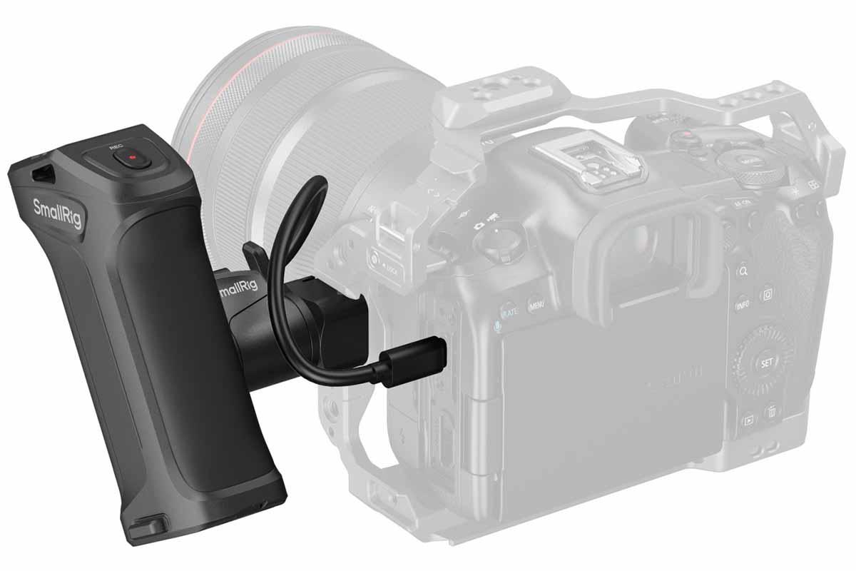 Der SmallRig 5235 Rotating Side Handle with Trigger REC für Canon / Blackmagic Design Cameras ist ein drehbarer Seitengriff mit Auslöser für ausgewählte Canon und BMD Kameras. Dank der Silikonbeschichtung lieg der Griff sicher in der Hand. Er lässt sich in beide Richtungen um volle 360° drehen, um ein bestmögliches Handling zu erlauben. Wird der Griff mit dem beiliegenden Steuerungskabel an die Kamera angeschlossen, lässt diese sich mit dem Knopf am Griff auslösen. Er ist kompatibel mit einem separat erhältlichen NP-F550 / 570 Akku, welcher auch unterseitig befestigt werden kann, um über den USB-C-Port des Griffs weitere Geräte aufzuladen. Dabei unterstützt viele Schnellladeprotokolle wie PD, QC, AFC und FCP. Außerdem bietet der Griff 1/4"-20-Gewinde, einen Kaltschuh und eine Halterung für Handgelenksschlaufen.