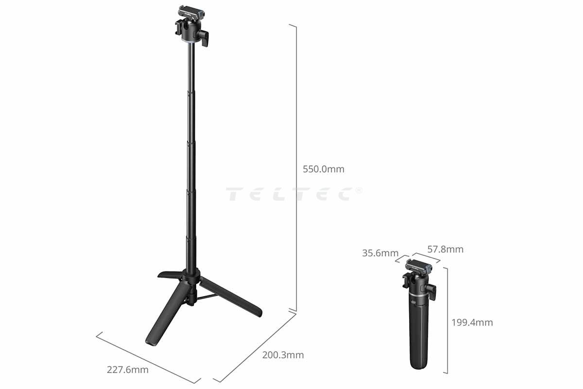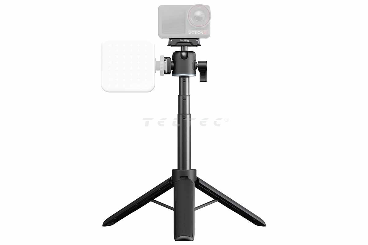 Das SmallRig 5435 Grip-Stativ für Actionkameras ist ein 2-in-1-Stativ mit einer integrierten Schnellwechselplatte, welche die Montage einer DJI Osmo Action 3, 4 oder 5 Pro Kamera ermöglicht und zusätzlich als Selfie-Stick einsetzbar ist. Mit dem 360° Kugelkopf werden kreative Blickwinkel für Vlogging, Interviews oder Selfies erreicht. Optimiert für den Transport lässt sich die 4-stufige Teleskopstange auf 20 cm zusammenklappen. Für Overhead-Aufnahmen ist der Auszug auf bis zu 55 cm möglich. An der Oberseite befindet sich eine 1/4"-20-Schraube, die zur Aufnahme von Actionkameras, Webcams, spiegellosen Kameras und anderen Geräten mit einer maximalen Traglast von 500 g dient. Seitlich ist eine Blitzschuhhalterung implementiert, die beispielsweise zur Montage von externen Mikrofonen oder LED-Leuchten verwendbar ist,