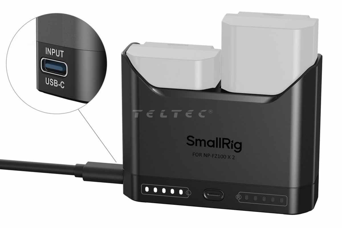 Das SmallRig 5489 Camera Battery Charger for NP-FZ100 USB-C Parallel-Ladegerät für ein oder zwei NP-FZ100 Akkutypen ist mit einer LED-Ladezustandsanzeige mit 5 Segmenten und einem integrierten Übertemperatur- und Überspannungsschutz ausgestattet.