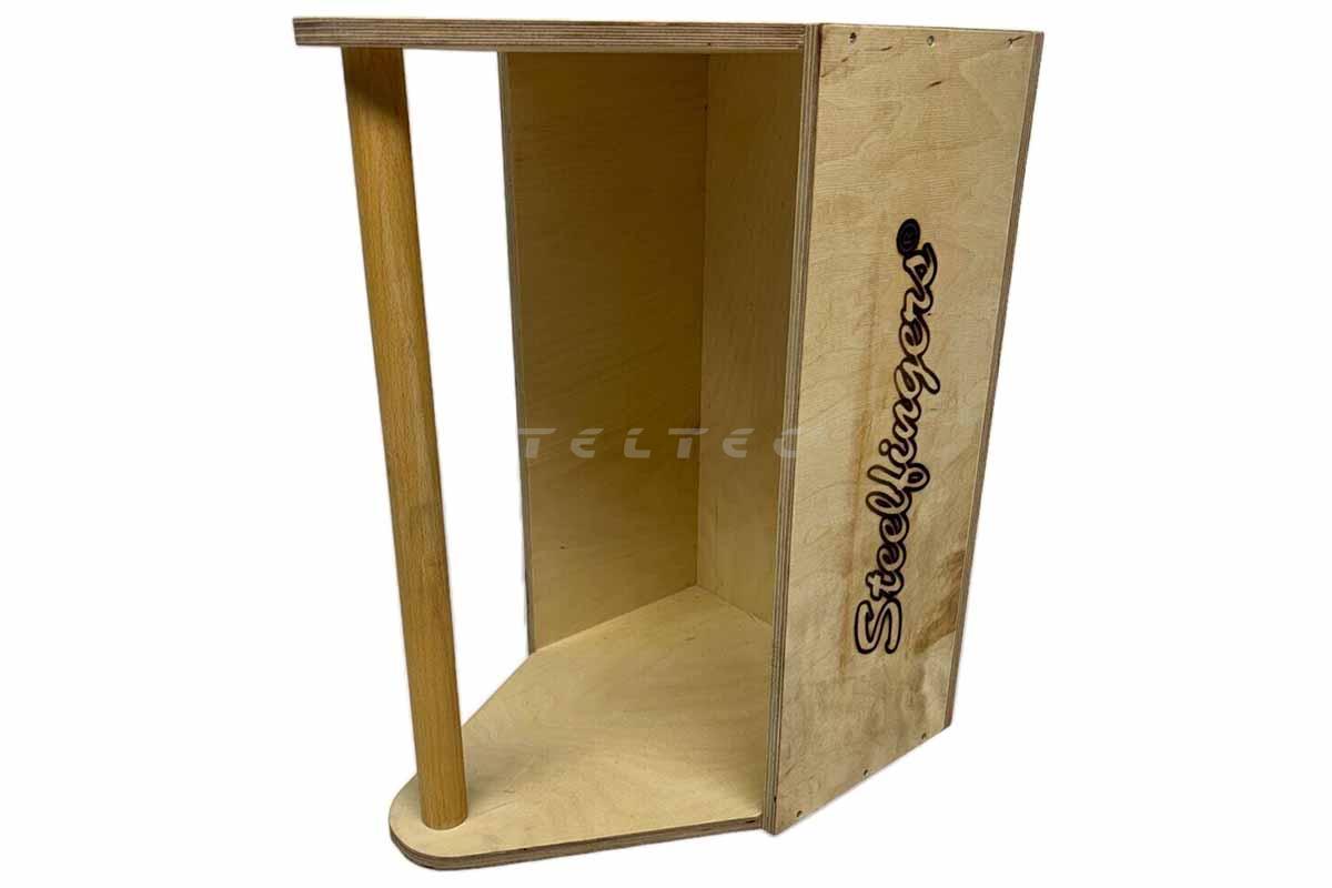 Die Steelfingers Werkzeugbox ist eine offene Werkzeugbox aus Holz. Auf der Vorderseite befindet sich ein gelasertes Steelfingers Logo. Die Box verfügt über einen Rundholz-Griff, der sich über die gesamte Länge der Box erstreckt.