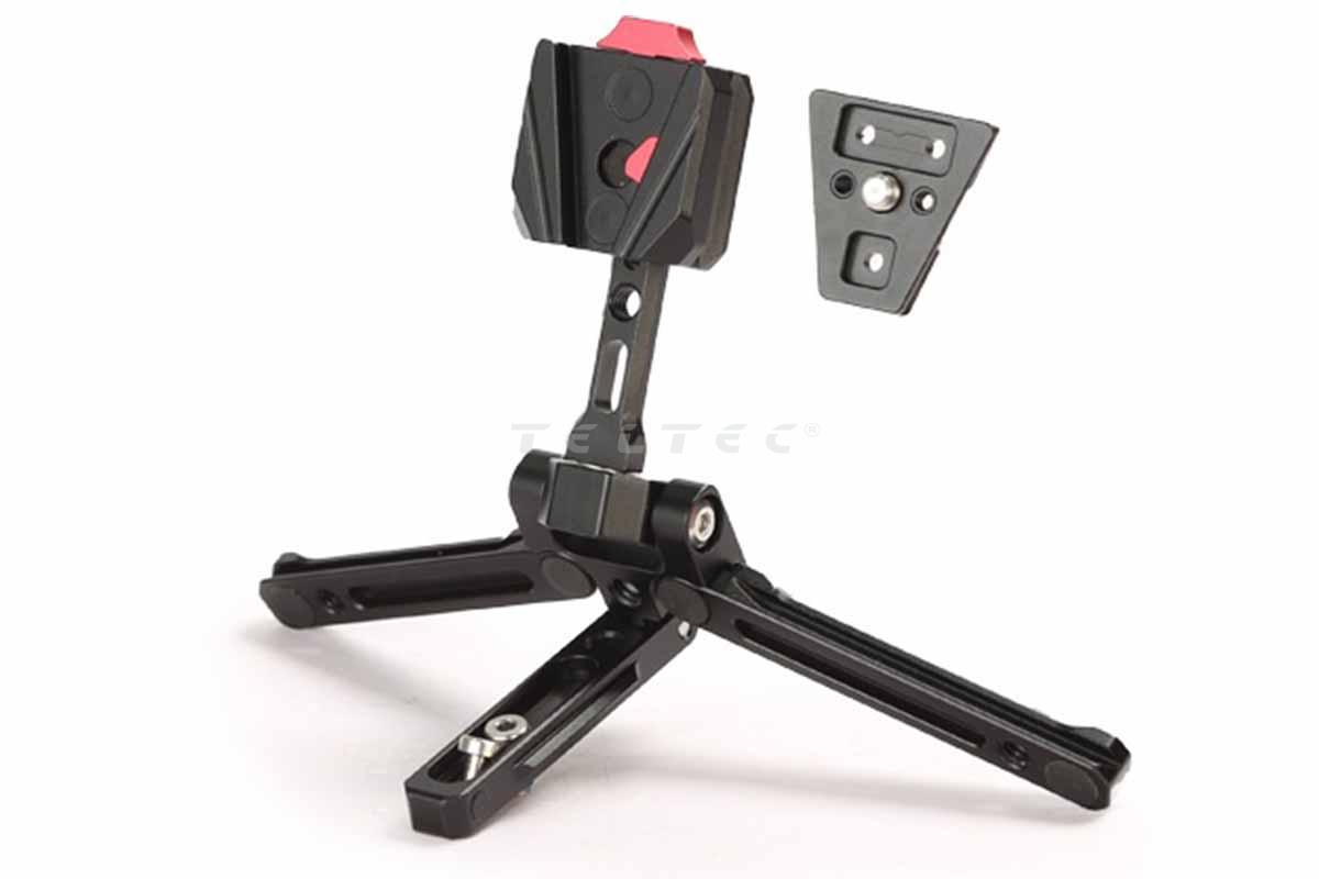 Das Swit TA-T10S ist eine Montageplatte mit V-Mount-Anschluss, die zusätzlich zu einem Tischstativ umgerüstet werden kann. Der TA-T10S hat eine Traglast von max. 2 kg und ist aus leichtem Aluminium gefertigt. Zudem ist der Kopf um 210° neig- und um 360° drehbar. Darüber hinaus verfügt die Montageplatte über den Arca Swiss Standard, sodass sie leicht an kompatiblen Arca Swiss Stativköpfen angebracht werden kann. Bei der Verwendung als Tischstativ werden die Stativbeine aus der Grundplatte ausgeklappt. Über die Schnellwechselplatte, die an vielen Videogeräten mittels 1/4"-Schraube befestigt wird, erfolgt anschließend die Montage auf dem Stativ.