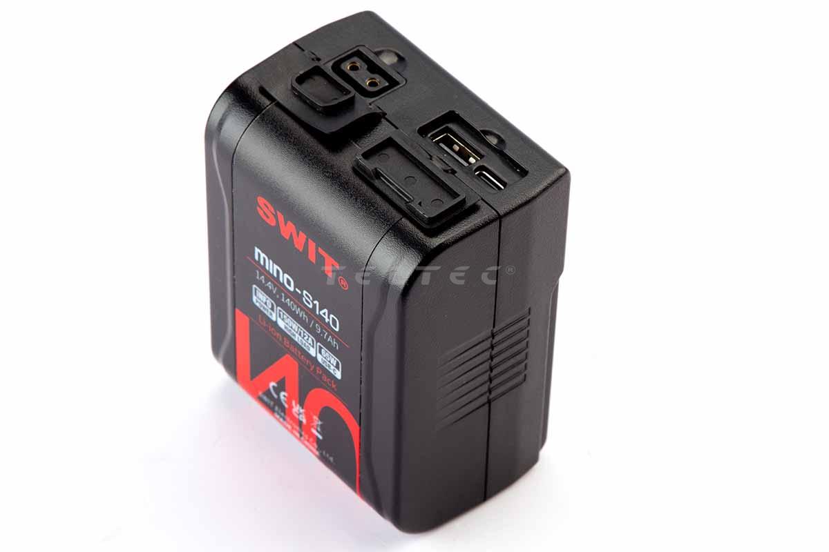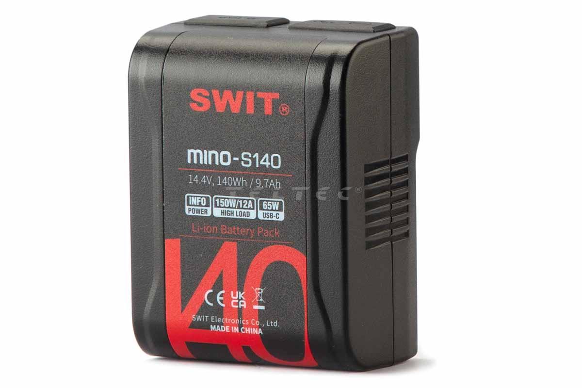 Der Swit MINO-S140 ist ein Lithium-Ionen V-Mount Akku mit einer besonders kompakten Bauform mit einer Kapazität von 140 Wh. Der Akku bietet eine Belastbarkeit von bis zu 150 W und 12 A Dauerstrom. Zusätzlich verfügt der Akku über mehrere Anschlüsse darunter einen USB (Typ A) Ausgang mit 5 V, 2 A, einen USB-C PD Anschluss (48 W Ladeeingang, 65 W Ausgang) und einen D-Tap Anschluss. Bei Kameras von Sony oder RED wird der Batteriestatus im Viewfinder angezeigt.